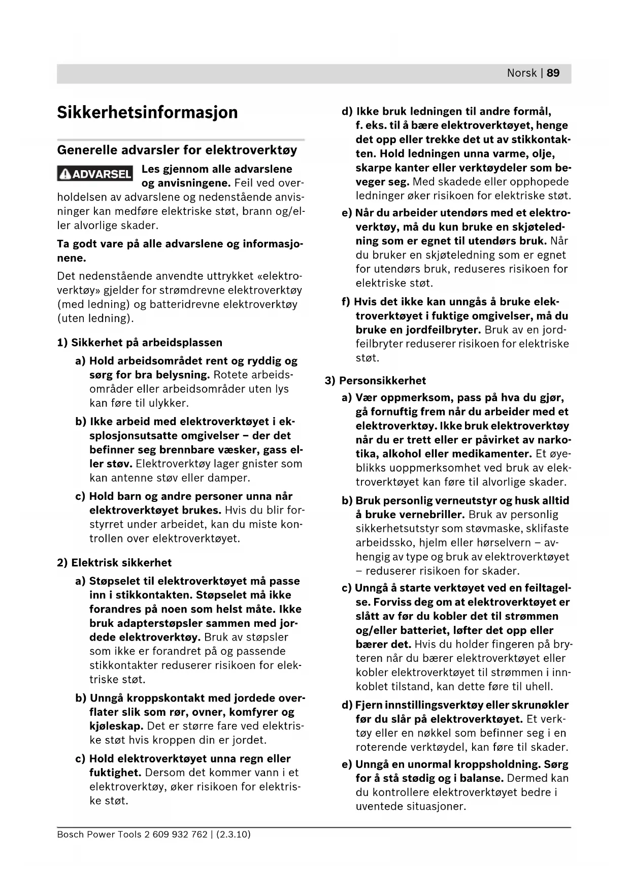 a) Vær oppmerksom, pass på hva du gjør, gå fornuftig frem når du arbeider med et elektroverktøy. Ikke bruk elektroverktøy når du er trett eller er påvirket av narko- tika, alkohol eller medikamenter. Et øye- blikks uoppmerksomhet ved bruk av elek- troverktøyet kan føre til alvorlige skader. b) Bruk personlig verneutstyr og husk alltid å bruke vernebriller. Bruk av personlig sikkerhetsutstyr som støvmaske, sklifaste arbeidssko, hjelm eller hørselvern – av- hengig av type og bruk av elektroverktøyet – reduserer risikoen for skader. c) Unngå å starte verktøyet ved en feiltagel- se. Forviss deg om at elektroverktøyet er slått av før du kobler det til strømmen og/eller batteriet, løfter det opp eller bærer det. Hvis du holder fingeren på bry- teren når du bærer elektroverktøyet eller kobler elektroverktøyet til strømmen i inn- koblet tilstand, kan dette føre til uhell. d) Fjern innstillingsverktøy eller skrunøkler før du slår på elektroverktøyet. Et verk- tøy eller en nøkkel som befinner seg i en roterende verktøydel, kan føre til skader. e) Unngå en unormal kroppsholdning. Sørg for å stå stødig og i balanse. Dermed kan du kontrollere elektroverktøyet bedre i uventede situasjoner. ADVARSEL OBJ_BUCH-824-002.book Page 89 Tuesday, March 2, 2010 9:44 AM90 | Norsk 2 609 932 762 | (2.3.10) Bosch Power Tools f) Bruk alltid egnede klær. Ikke bruk vide klær eller smykker. Hold hår, tøy og han- sker unna deler som beveger seg. Løst- sittende tøy, smykker eller langt hår kan komme inn i deler som beveger seg. g) Hvis det kan monteres støvavsug- og oppsamlingsinnretninger, må du forvisse deg om at disse er tilkoblet og brukes på korrekt måte. Bruk av et støvavsug redu- serer farer på grunn av støv.