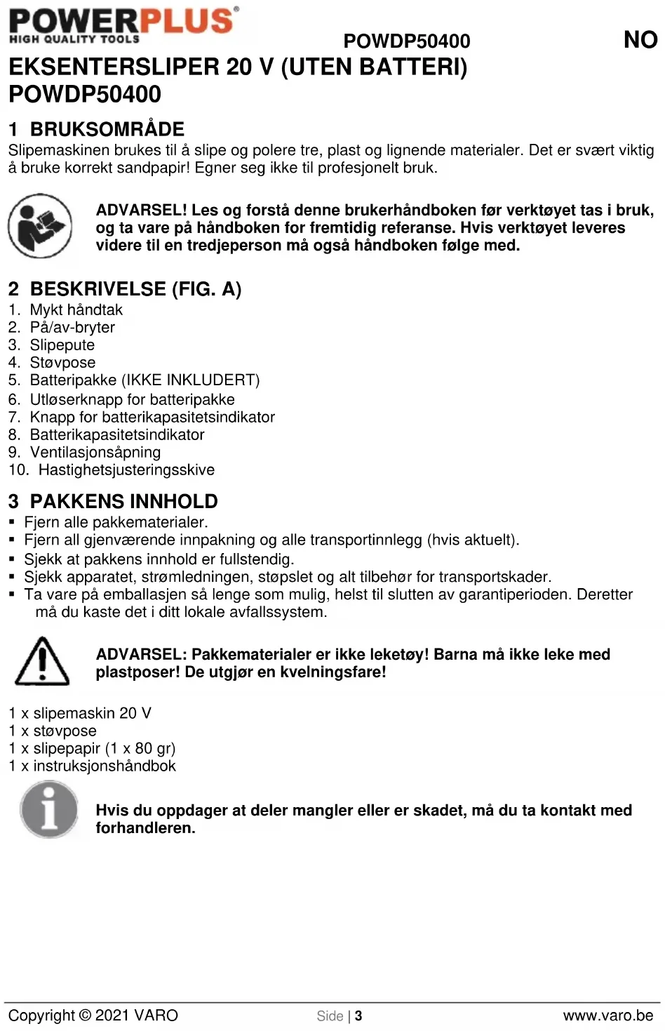 Copyright © 2021 VARO Side | 3 www.varo.be EKSENTERSLIPER 20 V (UTEN BATTERI) POWDP50400 1 BRUKSOMRÅDE Slipemaskinen brukes til å slipe og polere tre, plast og lignende materialer. Det er svært viktig å bruke korrekt sandpapir! Egner seg ikke til profesjonelt bruk. ADVARSEL! Les og forstå denne brukerhåndboken før verktøyet tas i bruk, og ta vare på håndboken for fremtidig referanse. Hvis verktøyet leveres videre til en tredjeperson må også håndboken følge med. 2 BESKRIVELSE (FIG. A)