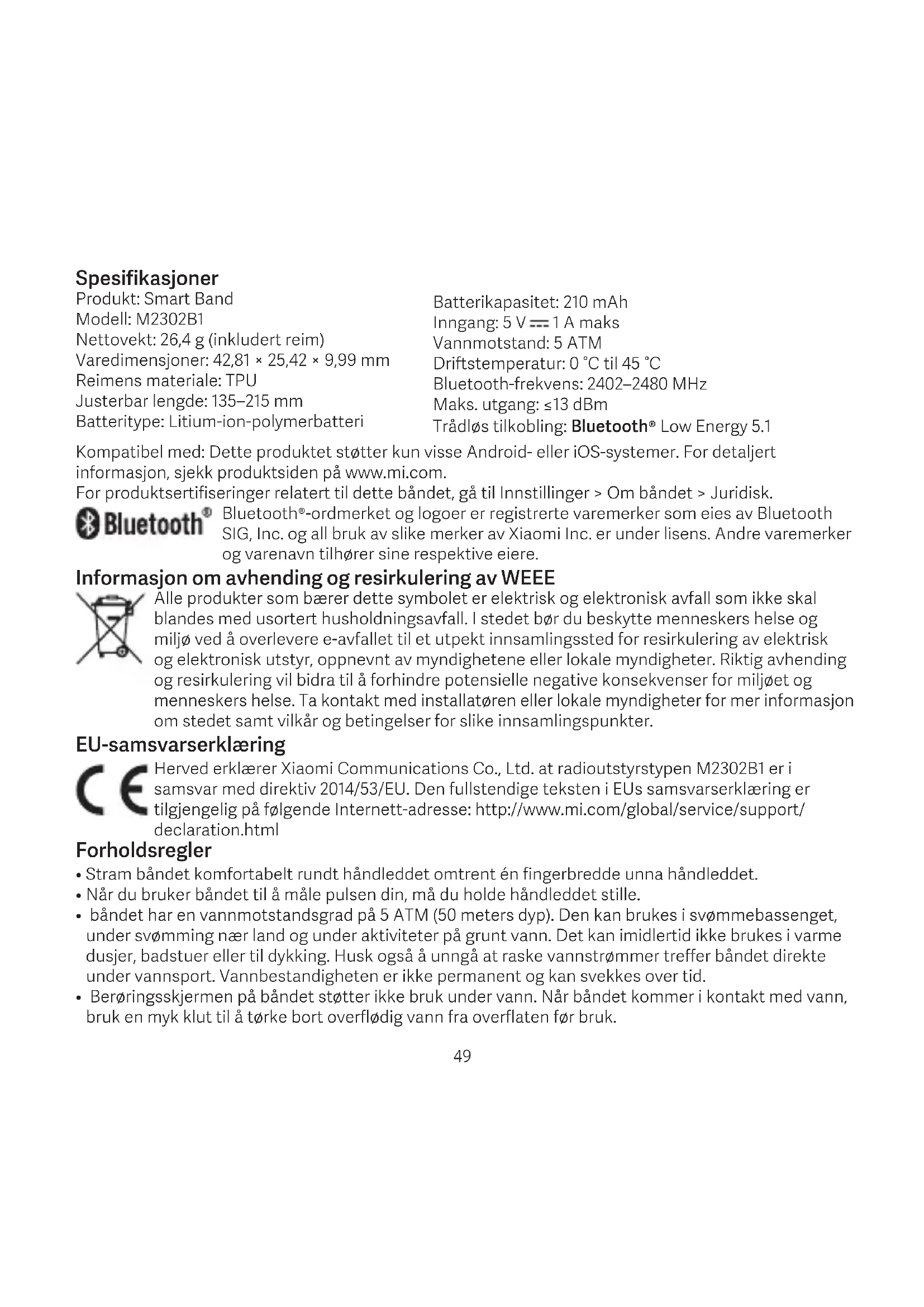 - Berøringsskjermen på båndet støtter ikke bruk under vann. Når båndet kommer i kontakt med vann, bruk en myk klut til å tørke bort overflødig vann fra overflaten før bruk. Spesifikasjoner Produkt: Smart Band Modell: M2302B1 Nettovekt: 26,4 g (inkludert reim) Varedimensjoner: 42,81×25,42×9,99 mm Reimens materiale: TPU Justerbar lengde: 135–215 mm Batteritype: Litium-ion-polymerbatteri Batterikapasitet: 210 mAh Inngang: 5 V 1 A maks Vannmotstand: 5 ATM Driftstemperatur: 0 °C til 45 °C Bluetooth-frekvens: 2402–2480 MHz Maks. utgang: ≤13 dBm Trådløs tilkobling: Bluetooth® Low Energy 5.1 49• Under daglig bruk må du unngå å ha båndet for stramt og prøve å holde kontaktområdet tørt. Rengjør armbåndet regelmessig med vann.