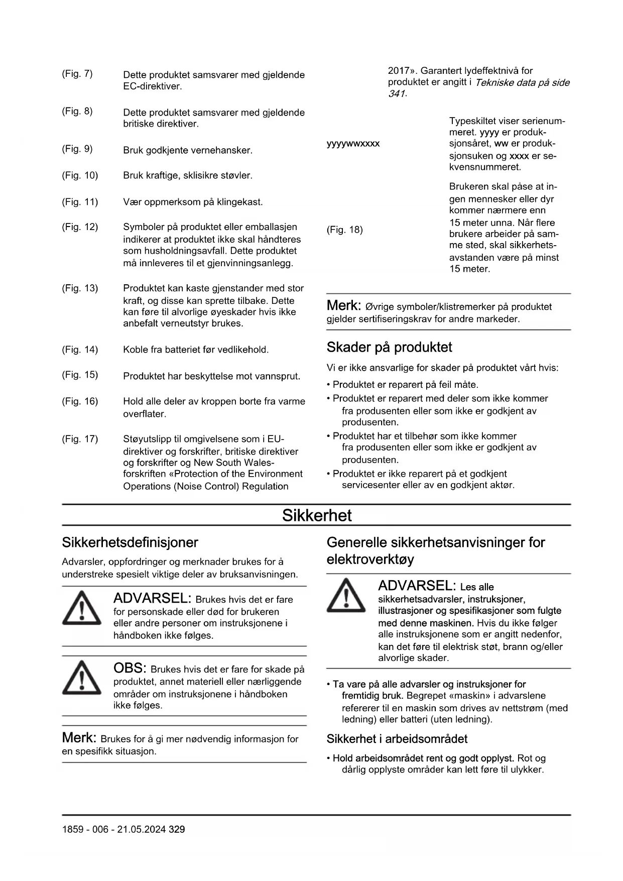 yyyywwxxxx Typeskiltet viser serienum- meret. yyyy er produk- sjonsåret, ww er produk- sjonsuken og xxxx er se- kvensnummeret. (Fig. 18) Brukeren skal påse at in- gen mennesker eller dyr kommer nærmere enn 15meter unna. Når flere brukere arbeider på sam- me sted, skal sikkerhets- avstanden være på minst 15meter. Merk: Øvrige symboler/klistremerker på produktet gjelder sertifiseringskrav for andre markeder. Skader på produktet Vi er ikke ansvarlige for skader på produktet vårt hvis:
