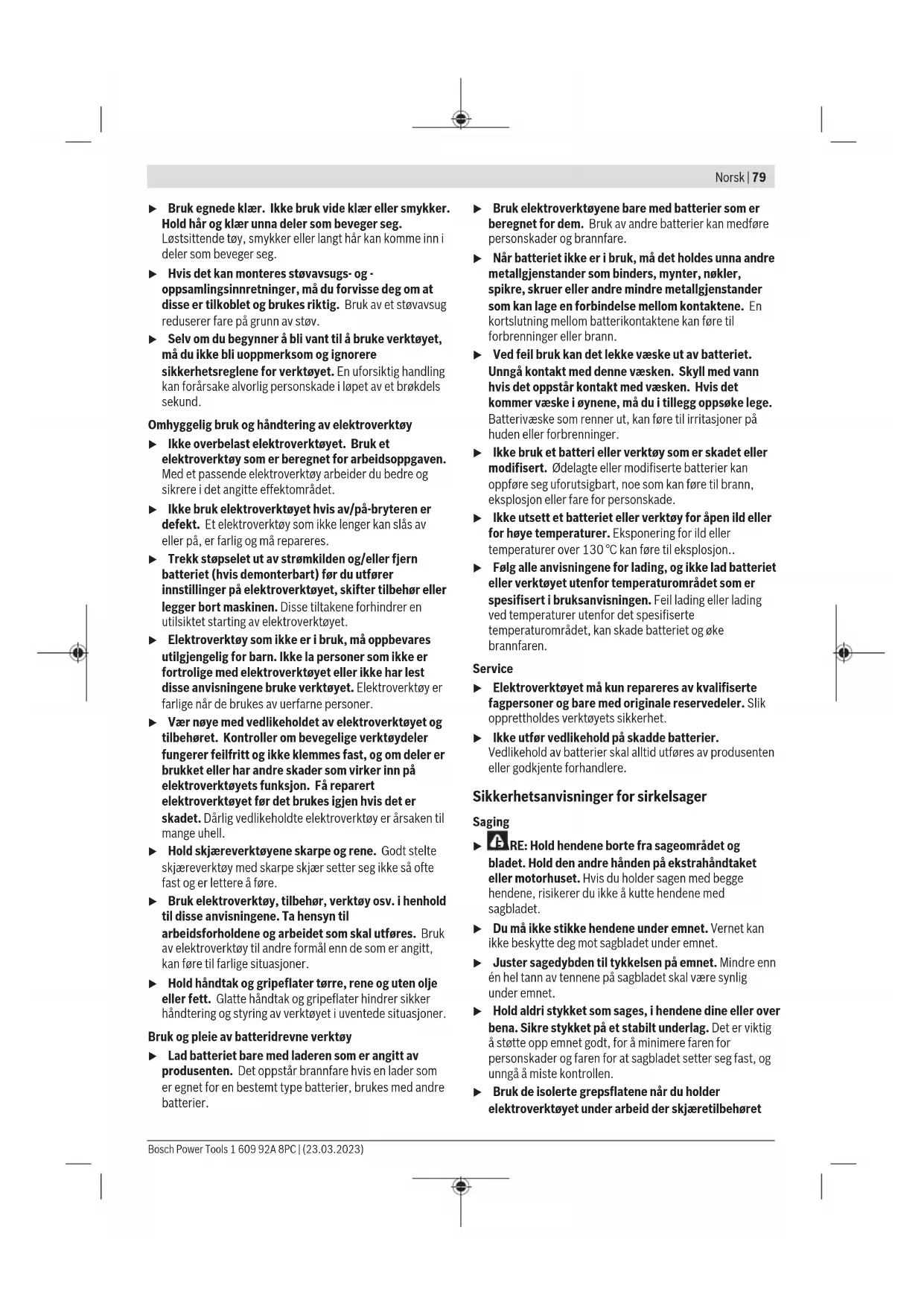 Vibrasjonsnivået og støyemisjonen som er angitt i disse anvisningene er målt i samsvar med en standardisert målemetode og kan brukes til sammenligning av elektroverktøy. Verdiene egner seg også til en foreløpig estimering av vibrasjonsnivået og støyutslippet. Angitt vibrasjonsnivå og støyutslipp representerer de hovedsakelige bruksområdene til elektroverktøyet. Men hvis elektroverktøyet brukes til andre formål, med andre innsatsverktøy eller utilstrekkelig vedlikehold, kan vibrasjonsnivået og støyutslippet avvike fra det som er angitt. Dette kan føre til en betydelig økning av vibrasjonsnivået og støyutslippet for hele arbeidstidsrommet. For en nøyaktig vurdering av vibrasjonsnivået og støyutslippet skal det også tas hensyn til de tidene verktøyet er slått av, eller går, men ikke faktisk er i bruk. Dette kan redusere vibrasjonsnivået og støyutslippet for hele arbeidstidsrommet betraktelig. Bestem ekstra sikkerhetstiltak til beskyttelse av brukeren mot vibrasjonenes virkning, som for eksempel: Vedlikehold av elektroverktøy og innsatsverktøy, holde hendene varme, organisere arbeidsforløpene. Batteri Bosch selger også batteridrevne elektroverktøy uten batteri. Det er angitt på emballasjen om et batteri følger med ditt elektroverktøy. Lade batteriet u Bruk bare laderne som er oppført i de tekniske spesifikasjonene. Kun disse laderne er tilpasset til Li- ion-batteriet som er brukt i elektroverktøyet. Merknad: I samsvar med internasjonale transportforskrifter blir litium-ion-batterier levert delvis ladet. For å sikre full effekt fra batteriet må du lade det helt opp før første gangs bruk. Sette inn batteriet Skyv det oppladede batteriet inn i batteriholderen til det låses ordentlig. Ta ut batteriet For å ta ut batteriet trykker du på utløserknappen og trekker batteriet ut. Ikke bruk makt. Indikator for batteriladenivå LED Kapasitet Lyser kontinuerlig 3×grønt 75–100% Lyser kontinuerlig 2×grønt 40–75% Lyser kontinuerlig 1×grønt 15–40% Blinker langsomt 1×grønt 0–15% De trelysdiodene i ladenivåindikatoren blinker raskt når temperaturen til batteriet er utenfor driftstemperaturområdet eller overbelastningsvernet har blitt aktivert. Regler for optimal bruk av oppladbare batterier Beskytt batteriet mot fuktighet og vann. Batteriet må oppbevares ved temperatur fra −20°C til 50°C. Du må for eksempel ikke la det ligge i bilen om sommeren. En vesentlig kortere driftstid etter oppladingen er et tegn på at batteriet er oppbrukt og må skiftes ut. Følg anvisningene om kassering. Montering u Bruk kun sagblad med en maksimal godkjent hastighet som er høyere enn elektroverktøyets tomgangsturtall. Støv-/sponavsug (se bildeB) Støv fra materialer som blyholdig maling, noen tresorter, mineraler og metall kan være helsefarlige. Berøring eller innånding av støv kan utløse allergiske reaksjoner og/eller åndedrettssykdommer hos brukeren eller personer som befinner seg i nærheten. Visse typer støv som eike- eller bøkestøv gjelder som kreftfremkallende, spesielt i kombinasjon med tilsetningsstoffer til trebearbeidelse (kromat, trebeskyttelsesmidler). Asbestholdig materiale må kun bearbeides av fagfolk. – Bruk helst et støvavsug som er egnet for dette materialet. – Sørg for god ventilasjon av arbeidsplassen. – Det anbefales å bruke en støvmaske med filterklasse P2. Følg ditt lands gyldige forskrifter for de materialene som skal bearbeides. u Unngå støv på arbeidsplassen. Støv kan lett antennes. 1 609 92A 8PC | (23.03.2023) Bosch Power ToolsNorsk | 83 Merknad: Bruk alltid styrerøret(21) under saging, slik at du ikke blir truffet av flyvende spon. Styrerøret (21) kan brukes med og uten tilkoblet støv-/ sponavsug. Drei styrerøret slik at spon ledes bort fra deg, og sett det fast i sponutkastet (16). Eksternt avsug (se bilde B) Sett en sugeslange (20) (tilbehør) på sponutkastet (16). Koble sugeslangen (20) til en støvsuger (tilbehør). Du finner en oversikt over tilkobling til forskjellige støvsugere sist i denne veiledningen. Støvsugeren må være egnet til materialet som skal bearbeides. Ved oppsuging av spesielt helsefarlig, kreftfremkallende eller tørt støv må du bruke en spesialstøvsuger. Sette på / bytte sirkelsagblad u Ta alltid batteriet ut av elektroverktøyet før arbeider på elektroverktøyet utføres (f.eks. vedlikehold, verktøyskifte osv.) og før transport og oppbevaring. Det er fare for skader hvis du trykker på av/på-bryteren ved en feiltagelse. u Bruk vernehansker ved montering av sagbladet. Ved berøring av sagbladet er det fare for skader. u Bruk aldri slipeskiver som innsatsverktøy. u Bruk kun sagblad som tilsvarer de tekniske dataene som er angitt i denne bruksanvisningen og på elektroverktøyet og som er kontrollert jf. EN847‑1 og tilsvarende markert. Velge sagblad Du finner en oversikt over anbefalte sagblad sist i denne veiledningen. Ta av sagblad (se bilde C) Når du skal bytte verktøy, er det best å legge elektroverktøyet på fronten av motorhuset. – Trykk på spindellåseknappen (22), og hold den inne. u Du må bare trykke på spindellåseknappen (22) når sagspindelen er stoppet. Elektroverktøyet kan ta skade hvis det velter. – Skru spennskruen (24) ut i dreieretningen ➊ med unbrakonøkkelen (23). – Sving pendelvernedekselet (11) tilbake, og hold det fast. – Ta spennflensen (25) og sagbladet (12) fra sagspindelen (27). Sette på sagblad (se bilde C) Når du skal bytte verktøy, er det best å legge elektroverktøyet på fronten av motorhuset. – Rengjør sagbladet (12) og alle fastspenningsdelene som skal monteres. – Sving pendelvernedekselet (11) tilbake, og hold det fast. – Sett sagbladet (12) på festeflensen (26). Tennenes kutteretning (pilens retning på sagbladet) og dreieretningspilen på vernedekselet (11)må stemme overens. – Sett på spennflensen (25), og skru inn spennskruen i dreieretningen ➋. Vær oppmerksom på riktig monteringsposisj