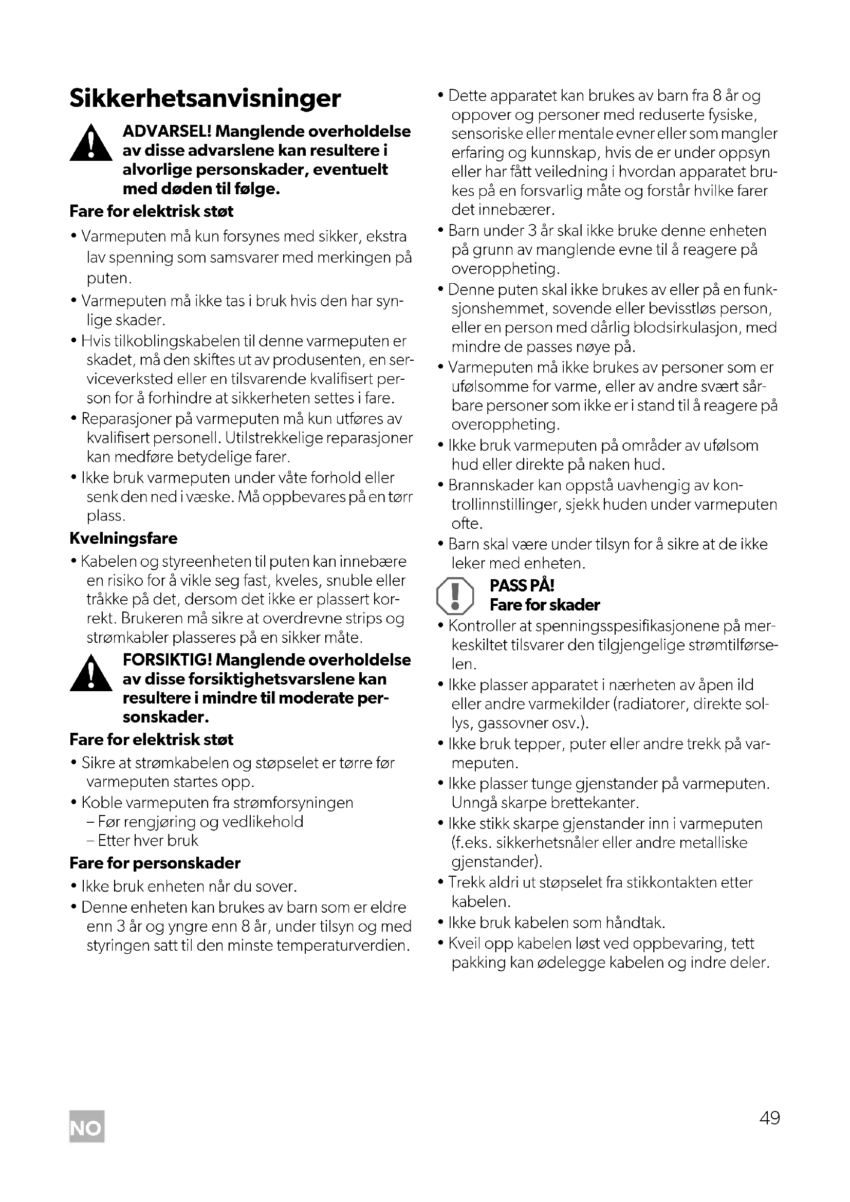- Denne puten skal ikke brukes av eller på en funk- sjonshemmet, sovende eller bevisstløs person, eller en person med dårlig blodsirkulasjon, med mindre de passes nøye på.