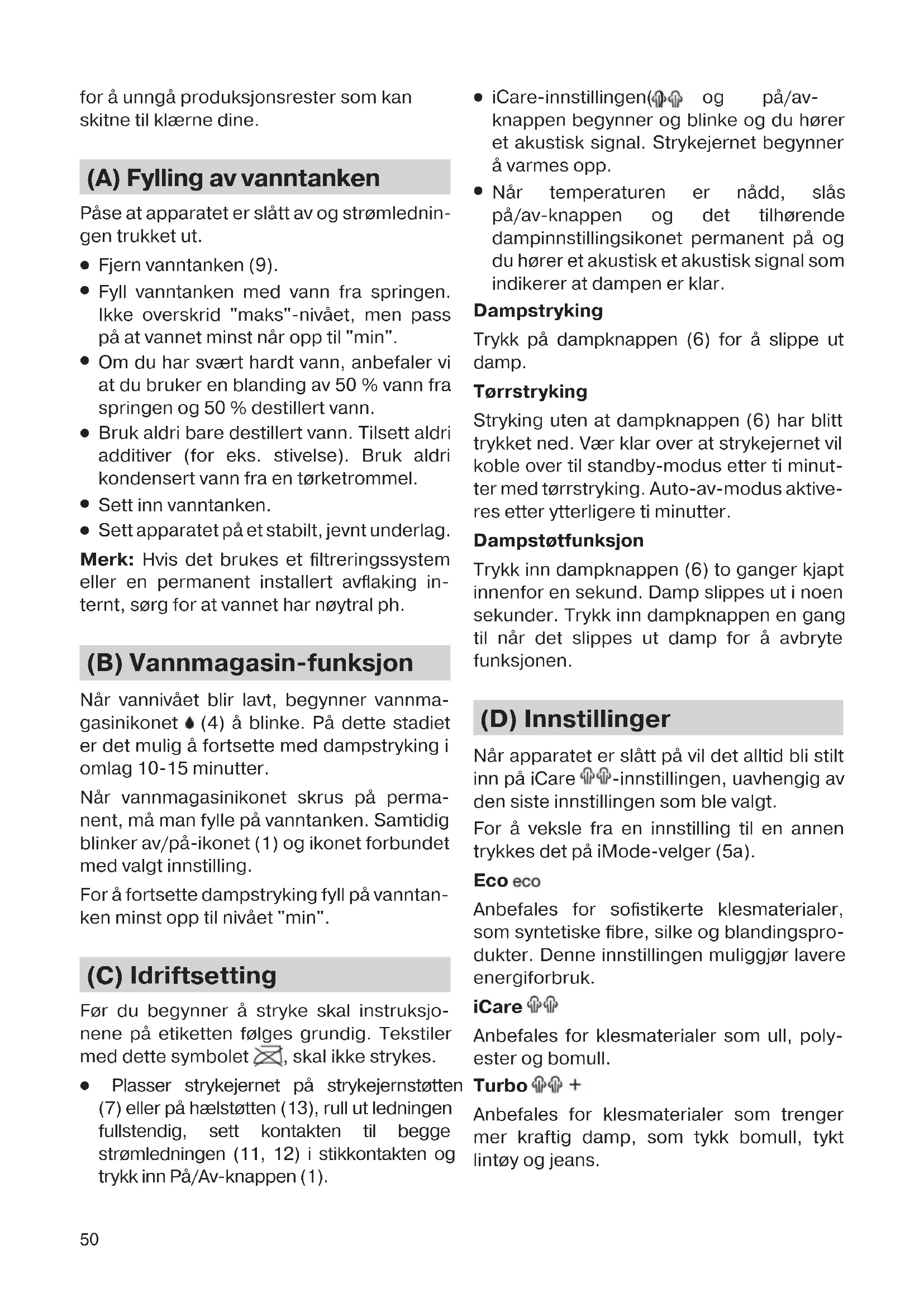 For å stoppe denne funksjonen trykker du på iMode-velgeren (5a) eller boost- knappen igjen. Etter 15 minutter kan du fortsette å stryke i turbo-modus. Obs: Boost-funksjonen er bare tilgjengelig hvis temperaturen er nådd og dampen er klar. ProSteam (kun CareStyle 7 Pro) Denne innstillingen gir opptil 30 sekunders kontinuerlig damp, uten å trykke på damp- knappen (6). Ettersom den har en damphastighet som ligner på iCare -innstillingen, så anbefa- les den for de samme klesplaggene som ull, polyester og bomull.