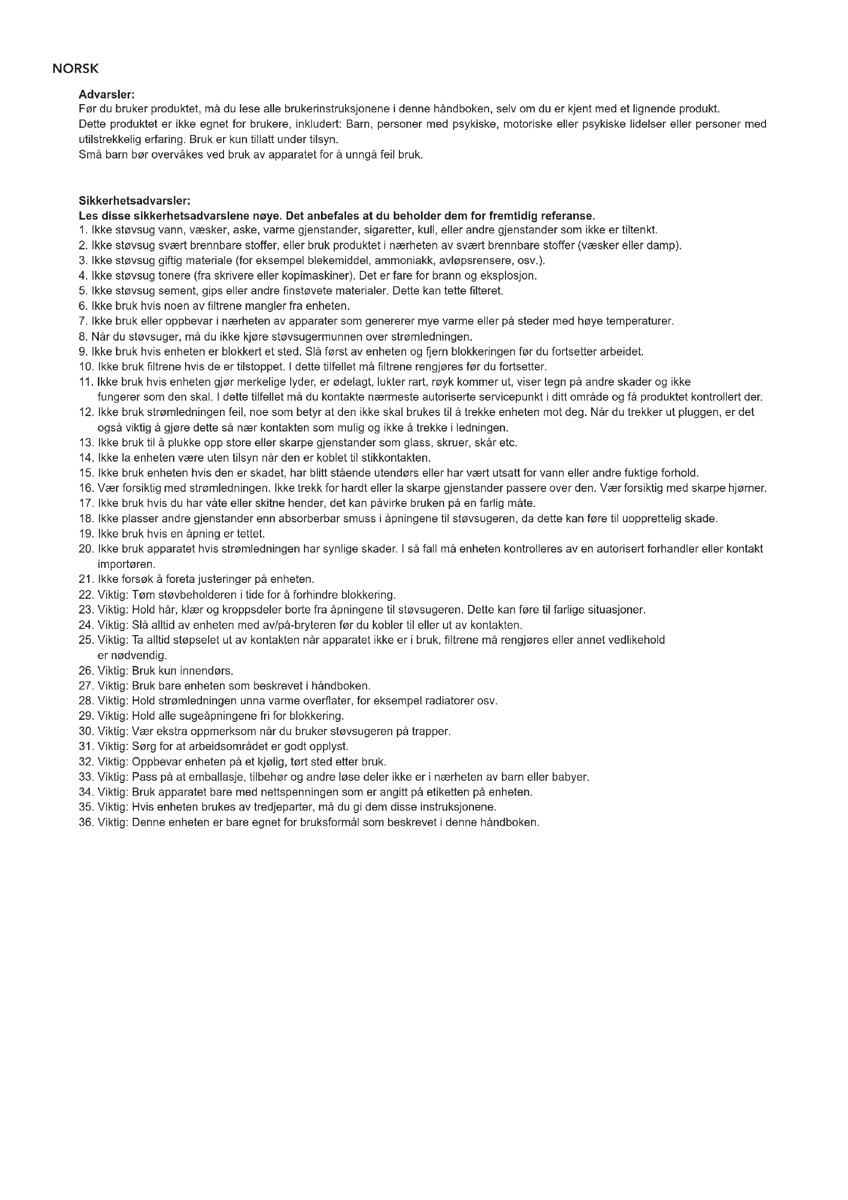 1. Ikke støvsug vann, væsker, aske, varme gjenstander, sigaretter, kull, eller andre gjenstander som ikke er tiltenkt.