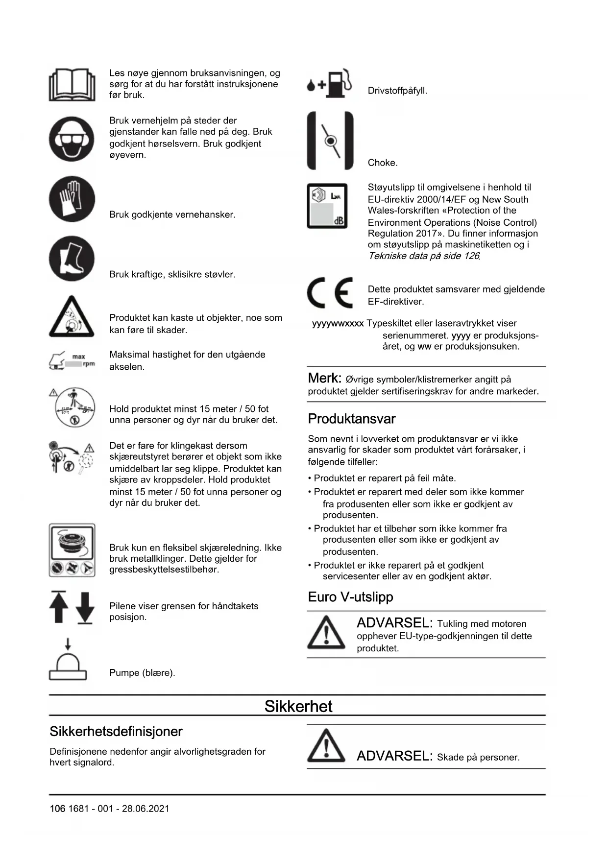 Symboler på produktet ADVARSEL! Dette produktet er farlig. Brukeren eller personer i nærheten kan rammes av personskade eller død dersom produktet ikke brukes forsiktig og korrekt. Les og følg alle sikkerhetsinstruksjonene i brukerhåndboken for å forhindre personskade på brukeren eller personer i nærheten. 1681 - 001 - 28.06.2021 105Les nøye gjennom bruksanvisningen, og sørg for at du har forstått instruksjonene før bruk. Bruk vernehjelm på steder der gjenstander kan falle ned på deg. Bruk godkjent hørselsvern. Bruk godkjent øyevern. Bruk godkjente vernehansker. Bruk kraftige, sklisikre støvler. Produktet kan kaste ut objekter, noe som kan føre til skader. Maksimal hastighet for den utgående akselen.