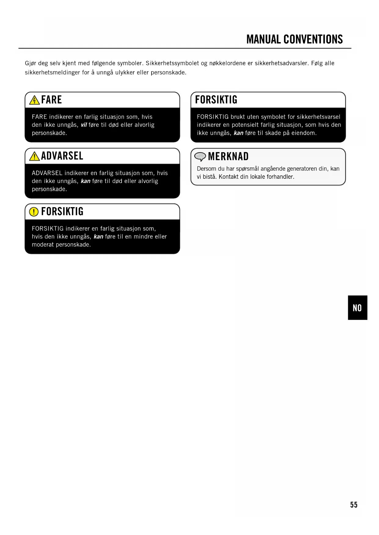 Gjør deg selv kjent med følgende symboler. Sikkerhetssymbolet og nøkkelordene er sikkerhetsadvarsler. Følg alle sikkerhetsmeldinger for å unngå ulykker eller personskade. MANUAL CONVENTIONS FORSIKTIG indikerer en farlig situasjon som, hvis den ikke unngås, kan føre til en mindre eller moderat personskade. FORSIKTIG FORSIKTIG brukt uten symbolet for sikkerhetsvarsel indikerer en potensielt farlig situasjon, som hvis den ikke unngås, kan føre til skade på eiendom. FORSIKTIG FARE indikerer en farlig situasjon som, hvis den ikke unngås, vil føre til død eller alvorlig personskade. FARE ADVARSEL indikerer en farlig situasjon som, hvis den ikke unngås, kan føre til død eller alvorlig personskade. ADVARSEL Dersom du har spørsmål angående generatoren din, kan vi bistå. Kontakt din lokale forhandler. MERKNAD56 SAFETy RULES Generatorens eksos inneholder karbonmonoksid, en fargeløs, luktfri og giftig gass. Innånding av karbonmonoksid vil føre til kvalme, svimmelhet, besvimelse eller død. Hvis du begynner å føle deg svimmel eller svak, kom deg til frisk luft umiddelbart. Generatoren skal kun brukes utendørs, på et godt ventilert område. IKKE bruk generatoren inne i eventuelle bygninger, inkludert garasjer, kjellere, krypkjellere og skur, lukkede rom eller liknende. Dette gjelder også generatorrommet i campingbiler. IKKE la eksosgasser trenge inn i trange rom via vinduer, dører, ventilasjonsluker eller andre åpninger. FARE KARBONMONOKSID: Å bruke en generator innendørs KAN TA LIVET AV DEG I LØPET AV MINUTTER. FARE Roterende deler kan ta tak i hender, føtter, hår, klær og/eller tilbehør. Det kan føre til alvorlige sårskader eller amputasjon. Hold hender og føtter vekk fra roterende deler. Sett opp langt hår og fjern smykker. Utstyret skal bare brukes med vern montert. IKKE ha på deg løstsittende plagg, hengende snorer eller ting som kan bli fanget. FARE Generatoren produserer kraftig spenning. IKKE berør uisolerte ledninger eller kontakter. IKKE bruk elektriske ledninger som er slitt, skadet eller frynsete. IKKE bruk generatoren i fuktig vær. IKKE la barn eller ukvalifisert personell betjene eller vedlikeholde generatoren Bruk en jordfeilbryter (GFCI) i fuktige områder og områder som inneholder ledende materiale, slik som metalldekke. Bruk godkjent overføringsutstyr til å isolere generatoren fra strømnettet, og gi beskjed til nettselskapet ditt før du kobler generatoren til strømsystemet ditt. FARE Gnister kan forårsake brann eller elektrisk støt. Ved service på generatoren: Koble fra tennpluggkabelen og plasser den et sted der den ikke kan komme i kontakt med pluggen. IKKE se etter gnist med tennpluggen tatt av. Bruk bare godkjente tennpluggtestere. ADVARSEL Motorer som går produserer varme. Alvorlige brannskader kan oppstå ved kontakt. Brennbare materialer kan ta fyr ved kontakt. IKKE berør varme overflater. Unngå kontakt med varme avgasser. La utstyret avkjøles før berøring. Sørg for å holde minst 1 meters klaring på alle sider for å sikre tilstrekkelig kjøling. Sørg for å holde minst 1,5 meters avstand til brennbare materialer. ADVARSEL Medisinsk bruk. Ved nødstilfelle, ring nødetatene umiddelbart. ALDRI bruk dette produktet til å forsyne livreddende utstyr eller redningsapparater med strøm. ALDRI bruk dette produktet til å forsyne medisinsk utstyr med strøm. Informer strømleverandøren din umiddelbart hvis du eller andre i husholdningen din er avhengig av elektrisk utstyr for å holde seg i live. Informer strømleverandøren din umiddelbart dersom tap av strøm fører til at du eller andre i husholdningen din kan få et medisinsk nødstilfelle. ADVARSEL Motoravgassene fra dette produktet inneholder kjemikalier som er kjent for å forårsake alvorlige helseproblemer og død. ADVARSEL Les denne håndboken grundig før du tar i bruk generatoren din. Unnlater du å følge instruksjonene kan det føre til alvorlig personskade eller død. ADVARSEL Dette produktet inneholder et knappebatteri. Ved svelging kan det forårsake personskade eller død i løpet av bare 2 timer. Oppsøk lege umiddelbart. ADVARSEL57