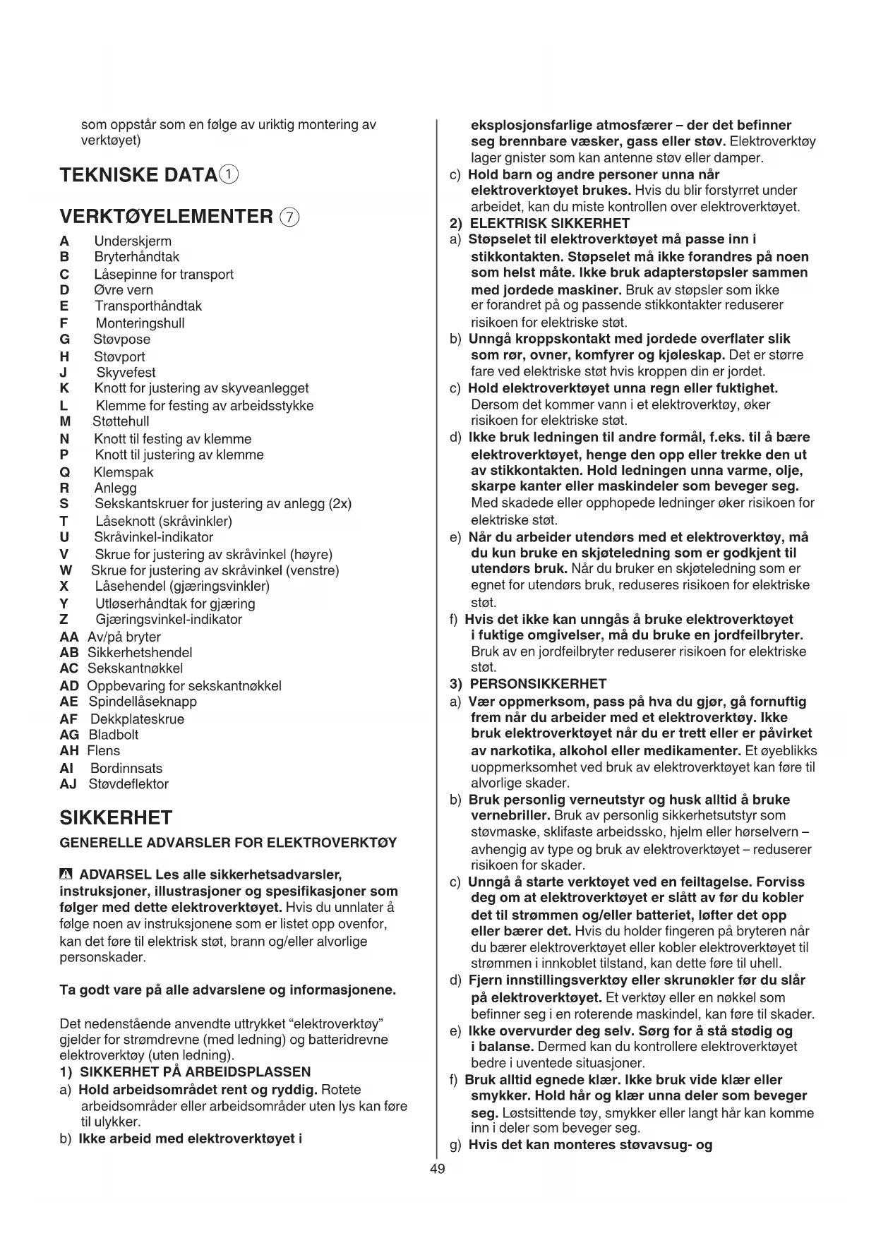 A Underskjerm B Bryterhåndtak C Låsepinne for transport D Øvre vern E Transporthåndtak F Monteringshull G Støvpose H Støvport J Skyvefest K Knott for justering av skyveanlegget L Klemme for festing av arbeidsstykke M Støttehull N Knott til festing av klemme P Knott til justering av klemme Q Klemspak R Anlegg S Sekskantskruer for justering av anlegg (2x) T Låseknott (skråvinkler) U Skråvinkel-indikator V Skrue for justering av skråvinkel (høyre) W Skrue for justering av skråvinkel (venstre) X Låsehendel (gjæringsvinkler) Y Utløserhåndtak for gjæring Z Gjæringsvinkel-indikator AA Av/på bryter AB Sikkerhetshendel AC Sekskantnøkkel AD Oppbevaring for sekskantnøkkel AE Spindellåseknapp AF Dekkplateskrue AG Bladbolt AH Flens AI Bordinnsats AJ Støvdeektor SIKKERHET