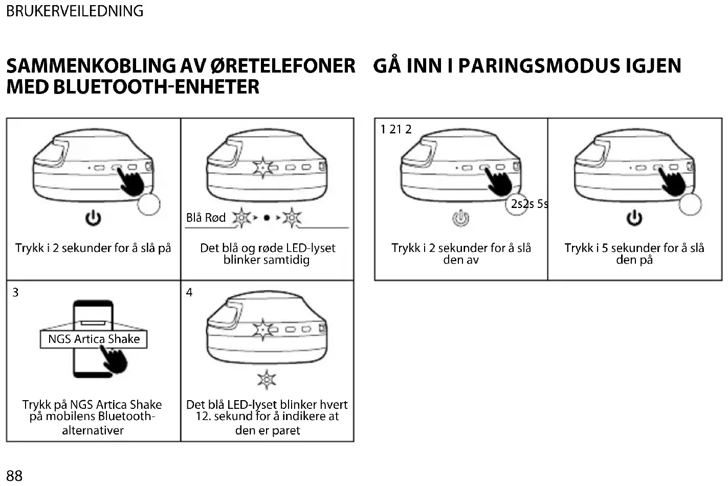 Blå Rød Det blå og røde LED-lyset blinker samtidig Slette NGS Artica Shake- enheten fra mobilen Hold knappene + og – nedtrykket i 10 sekunder LED-lampen vil blinke 3 ganger og deretter vil den slå seg av etter 2 sekunder Trykk i 5 sekunder for å slå den på Trykk i 2 sekunder for å slå den av 10s x3 2s 2s 5sBRUKERVEILEDNING
