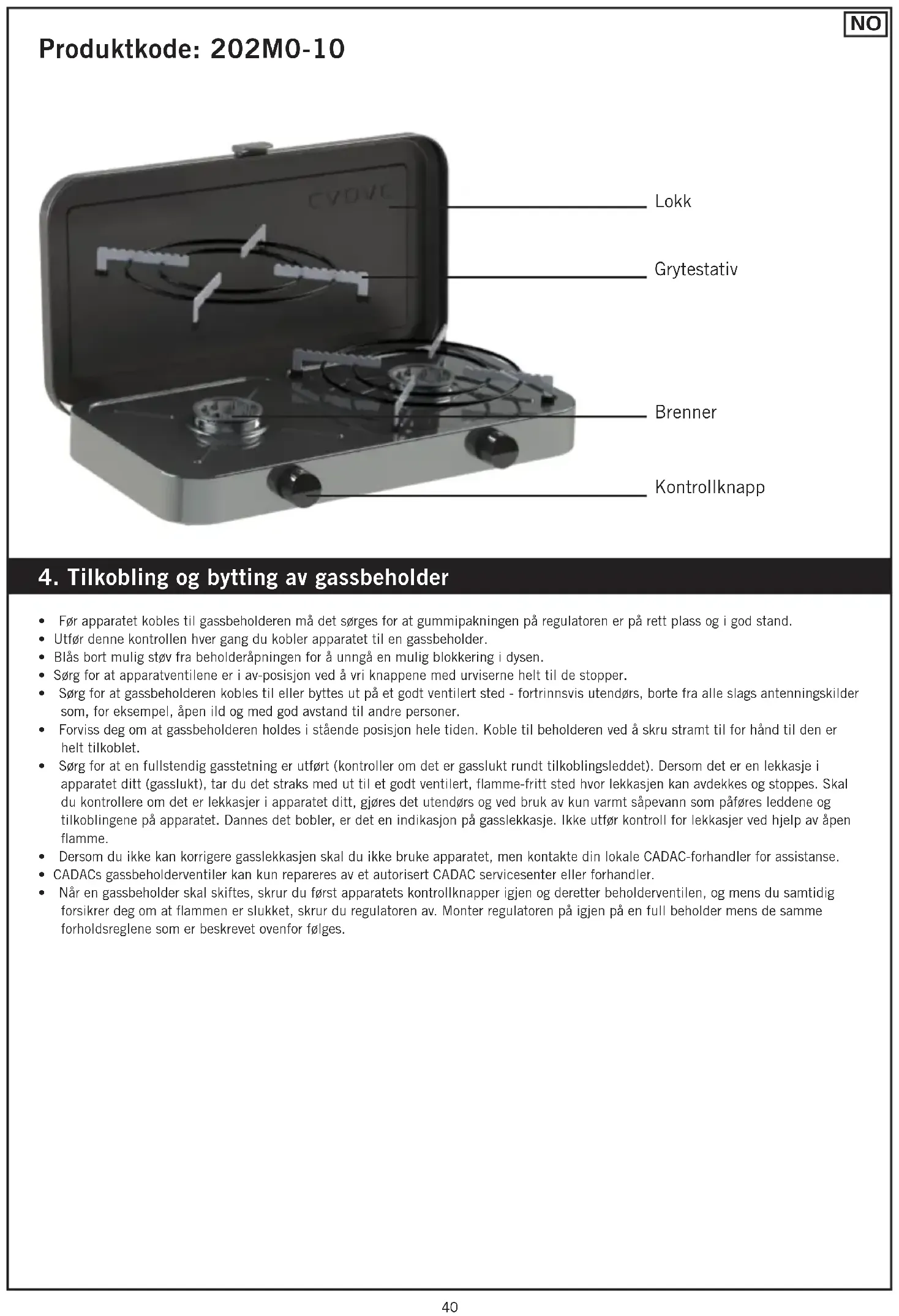 - Dersom du ønsker å kontrollere om det nnes lekkasjer på apparatet ditt, så gjør dette utendørs. Ikke forsøk å avdekke lekkasjer ved hjelp av ild / amme, bruk såpevann. Den riktige fremgangsmåten er å smøre sammenføyningene inn med såpevann. Dersom det danner seg bobler, betyr det at det nnes en gasslekkasje. Slå straks av gasstilførselen, ved først å lukke kontrollventilen på gassbeholderen og deretter apparatventilen; kontroller at alle tilkoblinger er skikkelig på plass. Kontroller en gang til med såpevann. Dersom gasslekkasjen vedvarer, returneres produktet til din CADAC-forhandler for kontroll / reparasjon.