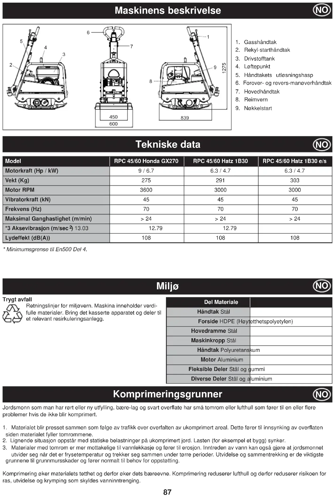 Altrad Belle forbeholder seg retten til å forandre på maskinens spesi¿ kasjon uten forhåndsmelding eller forpliktelse. Denne bruksanvisningen er blitt skrevet for å hjelpe deg å betjene og for å foreta service på ‘RPC’ /reversibel vibroplate/ uten å bli skadet. Denne bruksanvisningen er beregnet på forhandlere og operatører av ‘RPC’. Forord Avsnittet ‘Maskinens beskrivelse’ hjelper deg å bli kjent med maskinens layout og kontroller. Avsnittet ‘Miljø‘ informerer hvordan man skal greie å resirkulere et kassert apparat på en miljøvennlig måte. Avsnittene ‘Generell sikkerhet’ og ‘Helse og sikkerhet’ forklarer hvordan du skal bruke maskina for å forsikre din egen og allmenhet- ens sikkerhet. ‘Start- og stopp-prosedyre‘ hjelper deg å starte og stoppe maskina. ‘Feilsøkingsguide‘ hjelper deg hvis du har problemer med maskina di. Avsnittet ‘Service & vedlikehold’ skal hjelpe deg med generelt vedlikehold og ytelse av service på maskina di. Avsnittet ‘Garanti’ forteller inngående om hva garantien dekker og hvordan man skal reklamere. Avsnittet ‘Samsvarserklæring‘ viser standardene maskina er blitt bygget opp etter. Direktiver med hensyn til betegnelsene Teksten i denne brukerveiledningen som man skal rette spesiell oppmerksomhet til vises på følgende måte: DU MÅ LESE og STUDERE denne brukerveiledningen før du betjener eller vedlikeholder maskina. ADVARSEL87 Maskinens beskrivelse