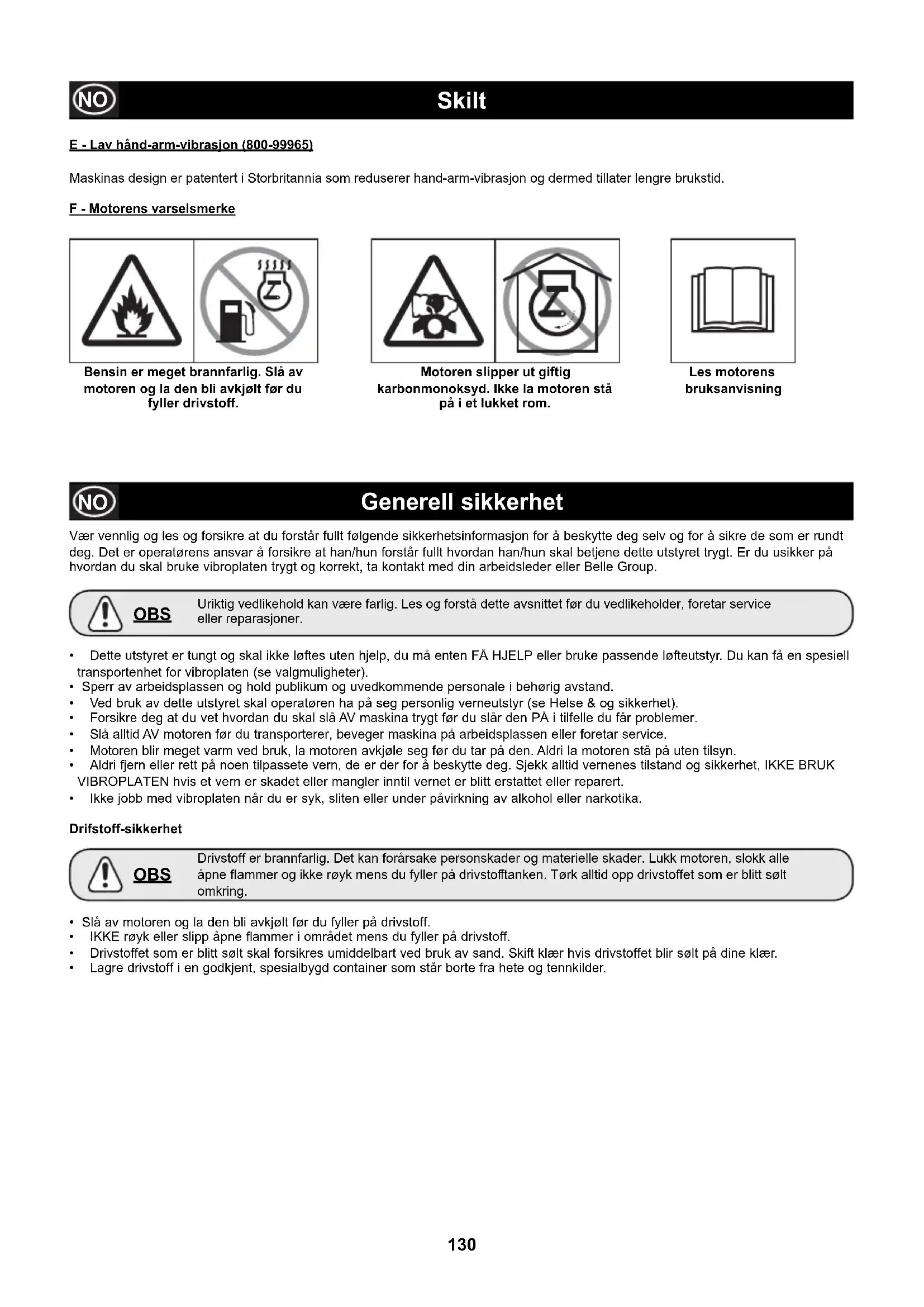 Uriktig vedlikehold kan være farlig. Les og forstå dette avsnittet før du vedlikeholder, foretar service eller reparasjoner. OBS Drivstoff er brannfarlig. Det kan forårsake personskader og materielle skader. Lukk motoren, slokk alle åpne ammer og ikke røyk mens du fyller på drivstofftanken. Tørk alltid opp drivstoffet som er blitt sølt omkring. OBS E - Lav hånd-arm-vibrasjon (800-99965) Maskinas design er patentert i Storbritannia som reduserer hand-arm-vibrasjon og dermed tillater lengre brukstid. F - Motorens varselsmerke Skilt Les motorens bruksanvisning Bensin er meget brannfarlig. Slå av motoren og la den bli avkjølt før du fyller drivstoff. Motoren slipper ut giftig karbonmonoksyd. Ikke la motoren stå på i et lukket rom. NO131 Helse og sikkerhet Vibrasjon Noe vibrasjon blir overført fra komprimeringsoperasjonen via håndtaket til operatørens hender. Belle Groups utvalg av vibroplater er blitt spesielt designet for å forminske hånd-/armvibrasjonsnivåer. Se spesi kasjoner & tekniske data om vibrasjonsnivåer og brukstider (anbefalt daglig maksimal eksponeringstid). IKKE overskrid de maksimale brukstidene. Personlig verneutstyr Ved bruk av utstyret skal man ha på seg egnet personlig verneutstyr som sikkerhetsbriller, hansker, hørselsvern, støvmaske og vernesko. Ta på klær som er egnet til arbeidet du utfører. Bind opp langt hår og fjern alle smykker som kan bli fanget av utstyrets bevegelige deler. Støv Komprimeringsprosessen produserer støv nå og da som kan være farlig for din helse. Ta alltid på maske som er egnet til å beskytte mot den type støv som blir produsert. Drivstoff Ikke svelg drivstoff eller inhaler drivstoffdamp og unngå at de får kontakt med huden din. Vask drivstoffsprut med en gang. Hvis du får drivstoff i øynene, spyl rikelig med vann og oppsøk legehjelp så fort som mulig. Eksosgasser