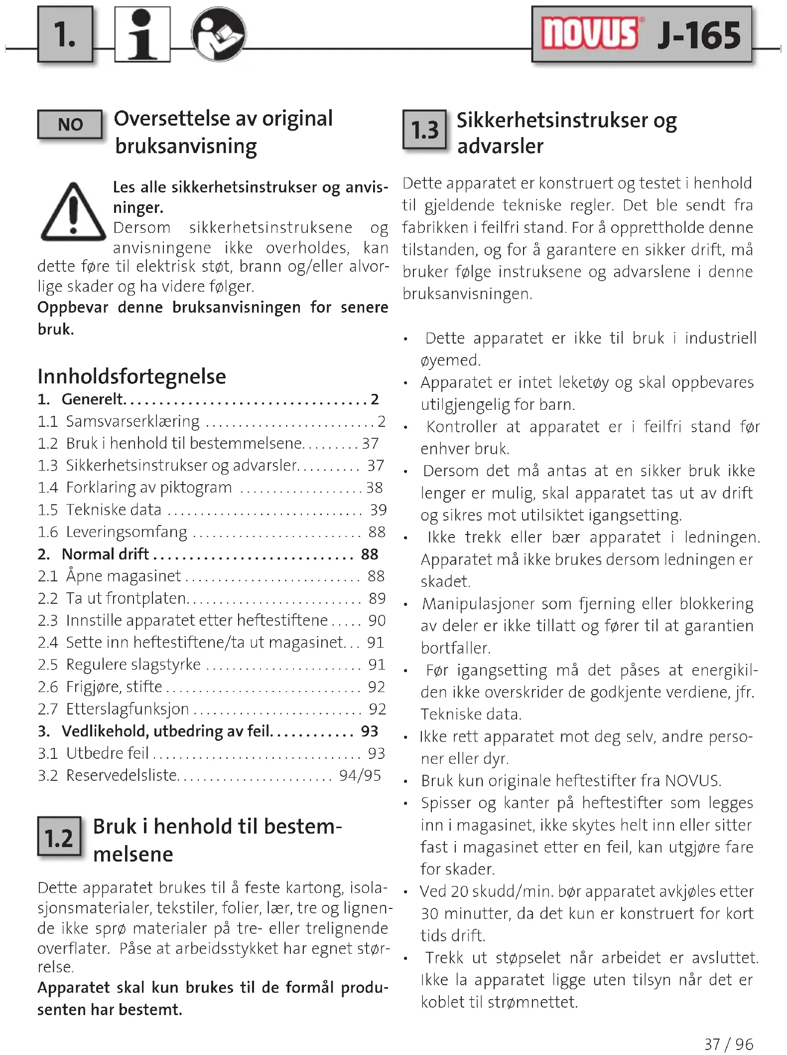 Sikkerhetsinstrukser og advarsler Dette apparatet er konstruert og testet i henhold til gjeldende tekniske regler. Det ble sendt fra fabrikken i feilfri stand. For å opprettholde denne tilstanden, og for å garantere en sikker drift, må bruker følge instruksene og advarslene i denne bruksanvisningen.• Dette apparatet er ikke til bruk i industriell øyemed.• Apparatet er intet leketøy og skal oppbevares utilgjengelig for barn.• Kontroller at apparatet er i feilfri stand før enhver bruk. • Dersom det må antas at en sikker bruk ikke lenger er mulig, skal apparatet tas ut av drift og sikres mot utilsiktet igangsetting.• Ikke trekk eller bær apparatet i ledningen. Apparatet må ikke brukes dersom ledningen er skadet.• Manipulasjoner som fjerning eller blokkering av deler er ikke tillatt og fører til at garantien bortfaller.• Før igangsetting må det påses at energikil-den ikke overskrider de godkjente verdiene, jfr. Tekniske data.• Ikke rett apparatet mot deg selv, andre perso-ner eller dyr.• Bruk kun originale heftestifter fra NOVUS. • Spisser og kanter på heftestifter som legges inn i magasinet, ikke skytes helt inn eller sitter fast i magasinet etter en feil, kan utgjøre fare for skader.• Ved skudd/min. bør apparatet avkjøles etter minutter, da det kun er konstruert for kort tids drift.• Trekk ut støpselet når arbeidet er avsluttet. Ikke la apparatet ligge uten tilsyn når det er koblet til strømnettet.38 / 96