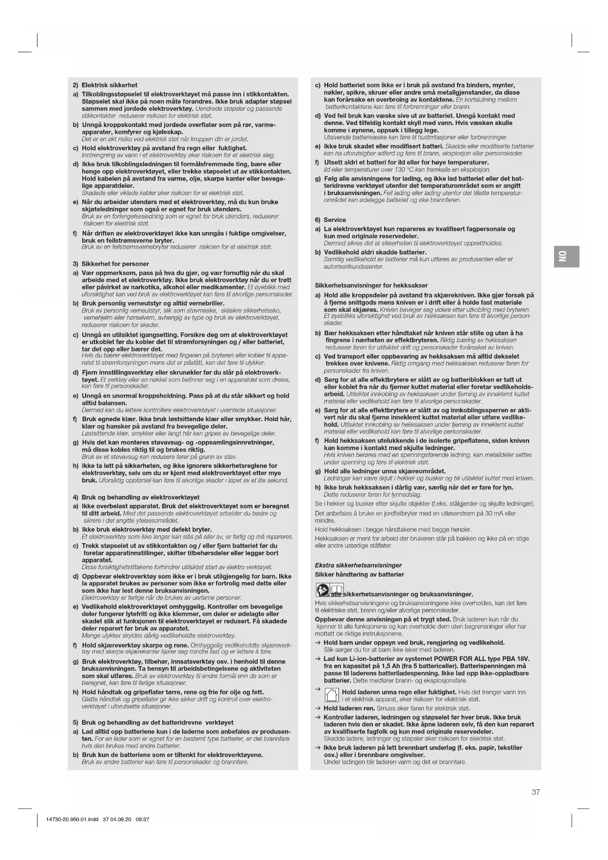 a) La elektroverktøyet kun repareres av kvalifisert fagpersonale og kun med originale reservedeler. Dermed sikres det at sikkerheten til elektroverktøyet opprettholdes. b) Vedlikehold aldri skadde batterier. Samtlig vedlikehold av batterier må kun utføres av produsenten eller et autorisert kundesenter. Sikkerhetsanvisninger for hekksakser a) Hold alle kroppsdeler på avstand fra skjærekniven. Ikke gjør forsøk på å fjerne snittgods mens kniven er i drift eller å holde fast materiale som skal skjæres. Kniven beveger seg videre etter utkobling med bryteren. Et øyeblikks uforsiktighet ved bruk av hekksaksen kan føre til alvorlige person- skader. b) Bær hekksaksen etter håndtaket når kniven står stille og uten å ha fingrene i nærheten av effektbryteren. Riktig bæring av hekksaksen reduserer faren for utilsiktet drift og personskader forårsaket av kniven. c) Ved transport eller oppbevaring av hekksaksen må alltid dekselet trekkes over knivene. Riktig omgang med hekksaksen reduserer faren for personskader fra kniven. d) Sørg for at alle effektbrytere er slått av og batteriblokken er tatt ut eller koblet fra når du fjerner kuttet material eller foretar vedlikeholds- arbeid. Utilsiktet innkobling av hekksaksen under fjerning av inneklemt kuttet material eller vedlikehold kan føre til alvorlige personskader. e) Sørg for at alle effektbrytere er slått av og innkoblingssperren er akti- vert når du skal fjerne inneklemt kuttet material eller utføre vedlike- hold. Utilsiktet innkobling av hekksaksen under fjerning av inneklemt kuttet material eller vedlikehold kan føre til alvorlige personskader. f) Hold hekksaksen utelukkende i de isolerte gripeflatene, siden kniven kan komme i kontakt med skjulte ledninger. Hvis kniven berøres med en spenningsførende ledning, kan metalldeler settes under spenning og føre til elektrisk støt. g) Hold alle ledninger unna skjæreområdet. Ledninger kan være skjult i hekker og busker og bli utilsiktet kuttet med kniven. h) Ikke bruk hekksaksen i dårlig vær, særlig når det er fare for lyn. Dette reduserer faren for lynnedslag. Se i hekker og busker etter skjulte objekter (f.eks. stålgjerder og skjulte ledninger). Det anbefales å bruke en jordfeilbryter med en utløserstrøm på 30 mA eller mindre. Hold hekksaksen i begge håndtakene med begge hender. Hekksaksen er ment for arbeid der brukeren står på bakken og ikke på en stige eller andre ustødige ståflater. Ekstra sikkerhetsanvisninger Sikker håndtering av batterier Les alle sikkerhetsanvisninger og bruksanvisninger. Hvis sikkerhetsanvisningene og bruksanvisningene ikke overholdes, kan det føre til elektriske støt, brann og/eller alvorlige personskader. Oppbevar denne anvisningen på et trygt sted. Bruk laderen kun når du kjenner til alle funksjonene og kan overholde dem uten begrensninger eller har mottatt de riktige instruksjonene. v Hold barn under oppsyn ved bruk, rengjøring og vedlikehold. Slik sørger du for at barn ikke leker med laderen. v Lad kun Li-ion-batterier av systemet POWER FOR ALL type PBA 18V. fra en kapasitet på 1,5 Ah (fra 5 battericeller). Batterispenningen må passe til laderens batteriladespenning. Ikke lad opp ikke-oppladbare batterier. Dette medfører brann- og eksplosjonsfare.