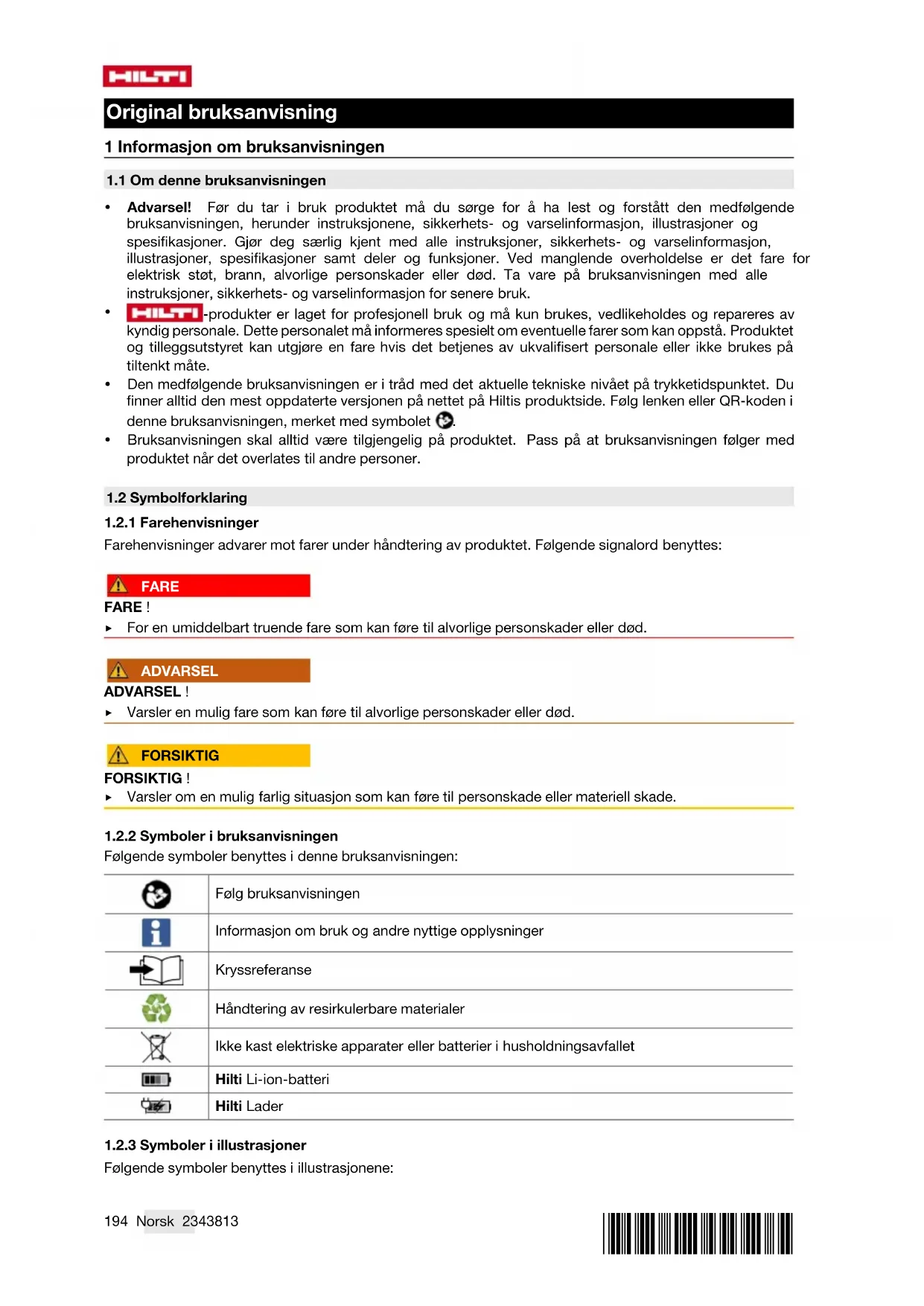 A/S: 080-220-2000 13 Hilti Li-ion-batterier Informasjon om sikkerhet og bruk I denne dokumentasjonen brukes begrepet batteri om oppladbare Hilti li-ion-batterier, der flere li-ion-celler er koblet sammen. De er beregnet for Hilti elektroverktøy og skal derfor bare brukes til disse. Bruk bare originale Hilti-batterier!212 Norsk 2343813 *2343813* Beskrivelse Hilti-batterier er utstyrt med cellestyrings- og cellebeskyttelsessystemer. Batterienebestårav celler som inneholderlitium-ion-lagringsmaterialersommuliggjørenhøy energitetthet. Li- ion-cellene har svært lav minneeffekt, men er svært følsomme overfor påvirkning fra ytre krefter, dyputlading eller høye temperaturer. Produktene som er godkjent for Hilti-batterier, finner du i nærmeste Hilti Store eller under: www.hilti.group Sikkerhet ▶ Ta hensyn til følgende sikkerhetsanvisninger for sikker håndtering og bruk av li-ion-batterier. Manglende overholdelse kan føre til hudirritasjoner, alvorlige korrosive skader, kjemiske forbrenninger, brann og/eller eksplosjoner. ▶ Behandle batterier med omhu for å unngå skader og forhindre at svært helseskadelige væsker lekker ut! ▶ Batterier må under ingen omstendigheter modifiseres eller manipuleres! ▶ Batteriene må ikke tas fra hverandre, klemmes, varmes opp over 80 °C eller brennes. ▶ Ikke bruk eller lad opp batterier som har vært utsatt for et støt eller er skadd på annen måte. Kontroller batteriene regelmessig for å se etter tegn på skader. ▶ Bruk aldri resirkulerte eller reparerte batterier.