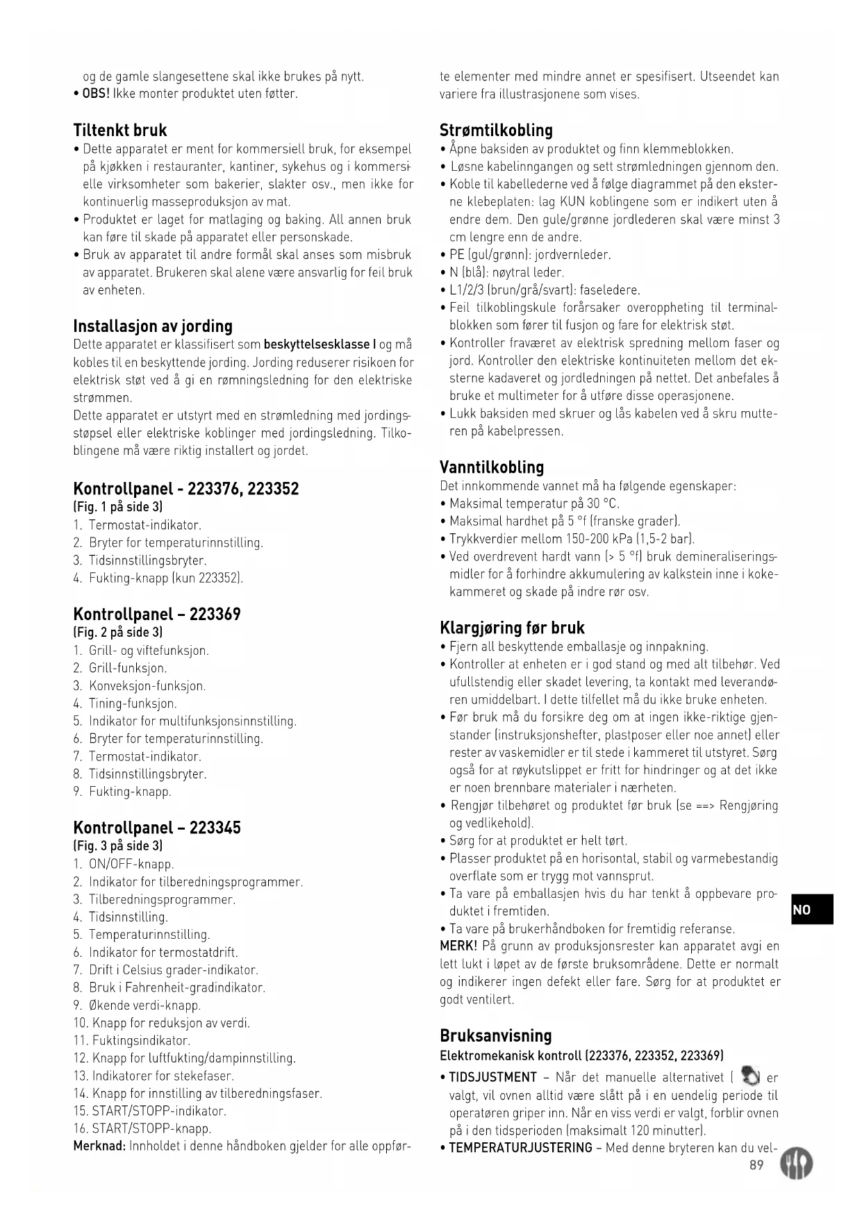 - Ta vare på brukerhåndboken for fremtidig referanse. MERK! På grunn av produksjonsrester kan apparatet avgi en lett lukt i løpet av de første bruksområdene. Dette er normalt og indikerer ingen defekt eller fare. Sørg for at produktet er godt ventilert. Bruksanvisning Elektromekanisk kontroll (223376, 223352, 223369)