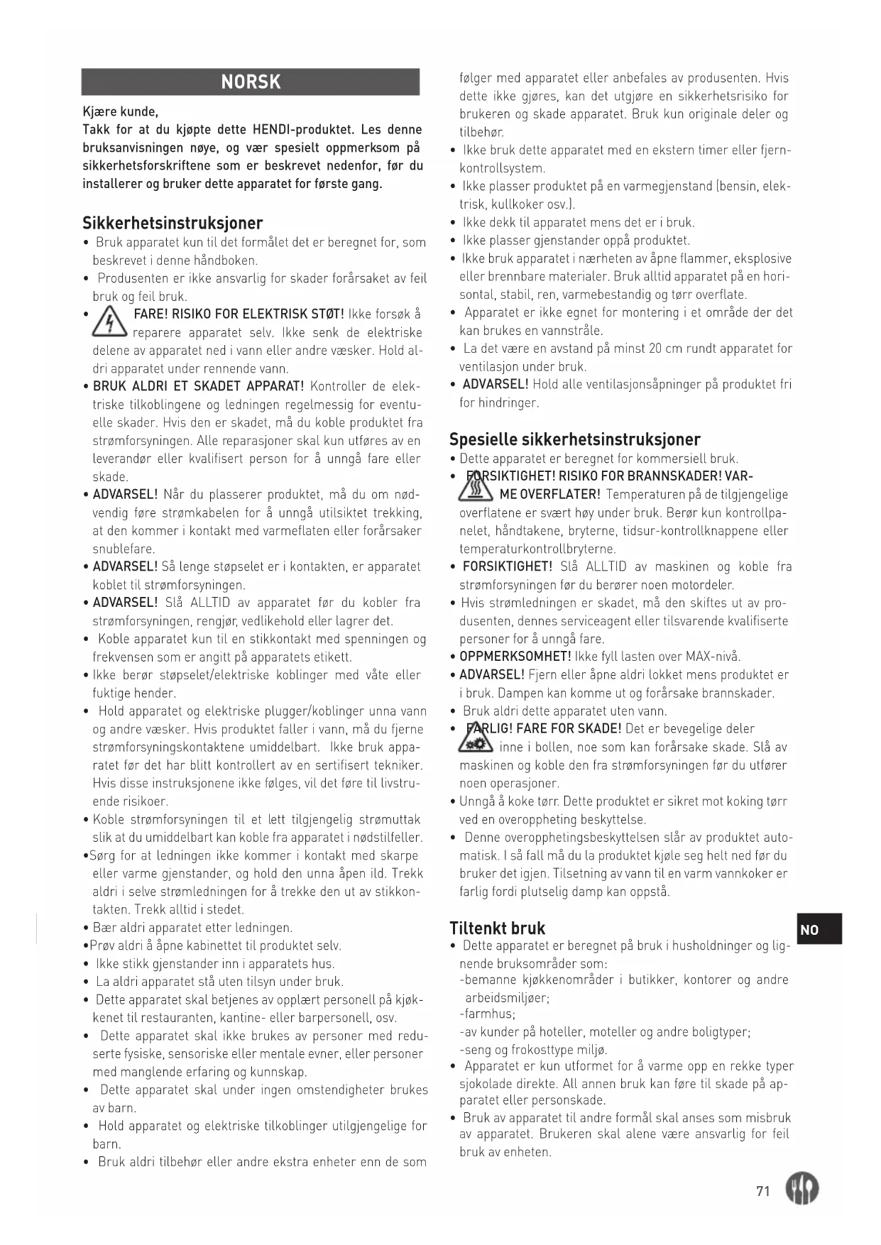 NORSK Kjære kunde, Takk for at du kjøpte dette HENDI-produktet. Les denne bruksanvisningen nøye, og vær spesielt oppmerksom på sikkerhetsforskriftene som er beskrevet nedenfor, før du installerer og bruker dette apparatet for første gang. Sikkerhetsinstruksjoner