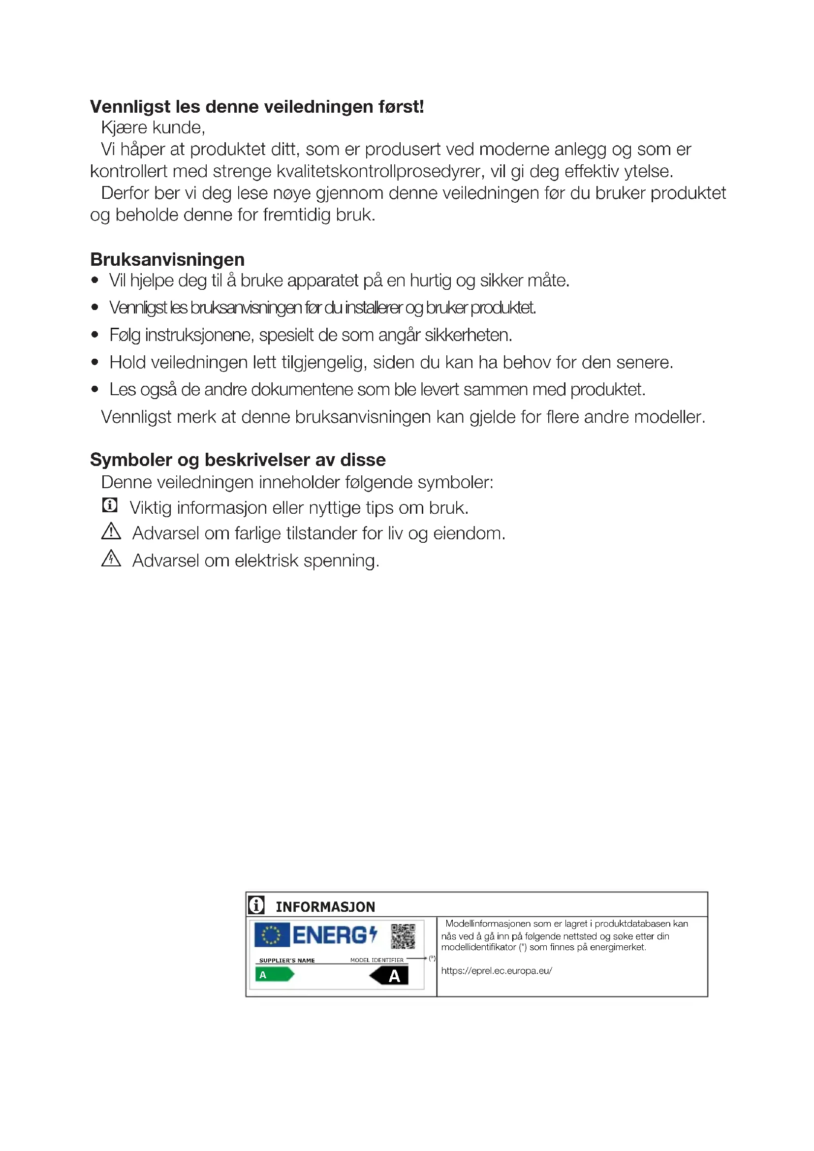 - Les også de andre dokumentene som ble levert sammen med produktet. Vennligst merk at denne bruksanvisningen kan gjelde for flere andre modeller. Symboler og beskrivelser av disse Denne veiledningen inneholder følgende symboler: C Viktig informasjon eller nyttige tips om bruk. A Advarsel om farlige tilstander for liv og eiendom. B Advarsel om elektrisk spenning. INFORMASJON
