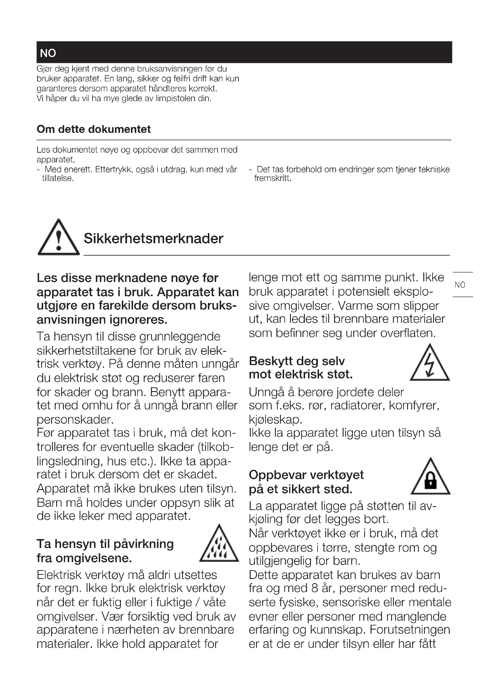 Sikkerhetsmerknader Gjør deg kjent med denne bruksanvisningen før du bruker apparatet. En lang, sikker og feilfri drift kan kun garanteres dersom apparatet håndteres korrekt. Vi håper du vil ha mye glede av limpistolen din. NOOversettelse av original bruksanvisning Om dette dokumentet Les dokumentet nøye og oppbevar det sammen med apparatet. - Med enerett. Ettertrykk, også i utdrag, kun med vår tillatelse. - Det tas forbehold om endringer som tjener tekniske fremskritt. Les disse merknadene nøye før apparatet tas i bruk. Apparatet kan utgjøre en farekilde dersom bruks- anvisningen ignoreres. Ta hensyn til disse grunnleggende sikkerhetstiltakene for bruk av elek- trisk verktøy. På denne måten unngår du elektrisk støt og reduserer faren for skader og brann. Benytt appara- tet med omhu for å unngå brann eller personskader. Før apparatet tas i bruk, må det kon- trolleres for eventuelle skader (tilkob- lingsledning, hus etc.). Ikke ta appa- ratet i bruk dersom det er skadet. Apparatet må ikke brukes uten tilsyn. Barn må holdes under oppsyn slik at de ikke leker med apparatet. Ta hensyn til påvirkning fra omgivelsene. Elektrisk verktøy må aldri utsettes for regn. Ikke bruk elektrisk verktøy når det er fuktig eller i fuktige/våte omgivelser. Vær forsiktig ved bruk av apparatene i nærheten av brennbare materialer. Ikke hold apparatet for lenge mot ett og samme punkt. Ikke bruk apparatet i potensielt eksplo- sive omgivelser. Varme som slipper ut, kan ledes til brennbare materialer som befinner seg under overflaten. Beskytt deg selv mot elektrisk støt. Unngå å berøre jordete deler som f.eks. rør, radiatorer, komfyrer, kjøleskap. Ikke la apparatet ligge uten tilsyn så lenge det er på. Oppbevar verktøyet på et sikkert sted. La apparatet ligge på støtten til av- kjøling før det legges bort. Når verktøyet ikke er i bruk, må det oppbevares i tørre, stengte rom og utilgjengelig for barn. Dette apparatet kan brukes av barn fra og med 8 år, personer med redu- serte fysiske, sensoriske eller mentale evner eller personer med manglende erfaring og kunnskap. Forutsetningen er at de er under tilsyn eller har fått