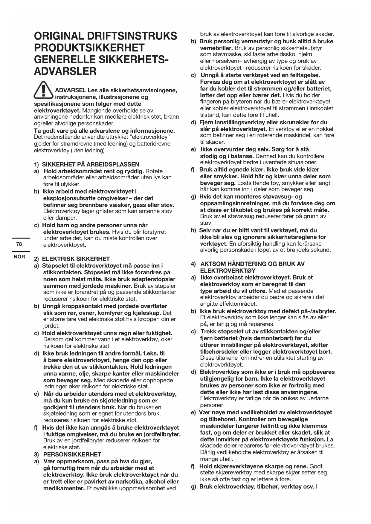 Personen, autoriseret til at udarbejde den tekniske l, Navn Marcel Filz Adresse Positec Germany GmbH Postfach 32 02 16, 50796 Cologne, Germany 2021/03/16 Allen Ding Vicechef; Ingeniør, Test & Certicering Positec Technology (China) Co., Ltd 18, Dongwang Road, Suzhou Industrial Park, Jiangsu 215123, P. R. China78 NOR ORIGINAL DRIFTSINSTRUKS PRODUKTSIKKERHET GENERELLE SIKKERHETS- ADVARSLER ADVARSEL Les alle sikkerhetsanvisningene, instruksjonene, illustrasjonene og spesifikasjonene som følger med dette elektroverktøyet. Manglende overholdelse av anvisningene nedenfor kan medføre elektrisk støt, brann og/eller alvorlige personskader. Ta godt vare på alle advarslene og informasjonene. Det nedenstående anvendte uttrykket “elektroverktøy” gjelder for strømdrevne (med ledning) og batteridrevne elektroverktøy (uten ledning).