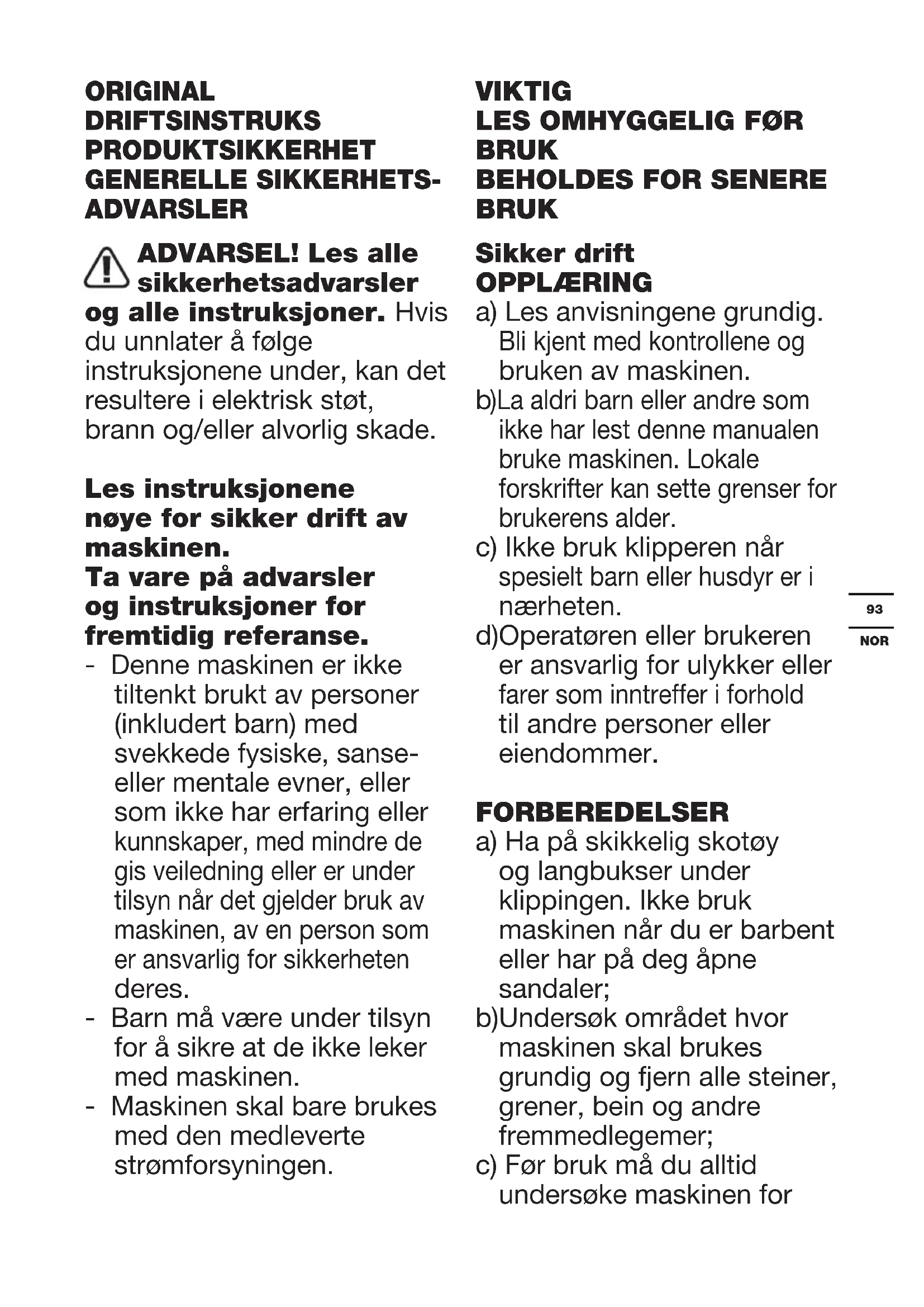 BRUK Sikker drift OPPLÆRING a) Les anvisningene grundig. Bli kjent med kontrollene og bruken av maskinen.