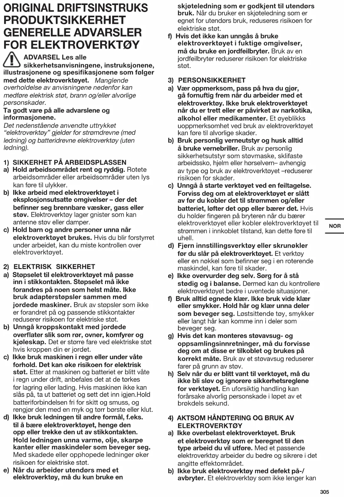 ADVARSEL Les alle sikkerhetsanvisningene, instruksjonene, illustrasjonene og spesifikasjonene som følger med dette elektroverktøyet. Manglende overholdelse av anvisningene nedenfor kan medføre elektrisk støt, brann og/eller alvorlige personskader. Ta godt vare på alle advarslene og informasjonene. Det nedenstående anvendte uttrykket “elektroverktøy” gjelder for strømdrevne (med ledning) og batteridrevne elektroverktøy (uten ledning).
