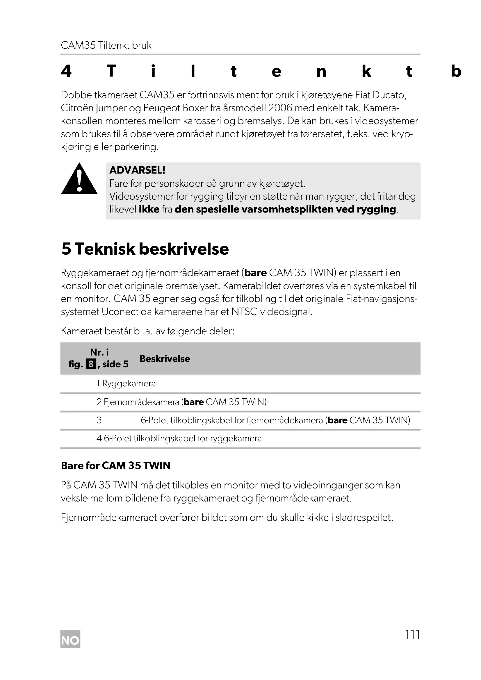 4Tiltenkt bruk Dobbeltkameraet CAM35 er fortrinnsvis ment for bruk i kjøretøyene Fiat Ducato, Citroën Jumper og Peugeot Boxer fra årsmodell 2006 med enkelt tak. Kamera- konsollen monteres mellom karosseri og bremselys. De kan brukes i videosystemer som brukes til å observere området rundt kjøretøyet fra førersetet, f.eks. ved kryp- kjøring eller parkering.