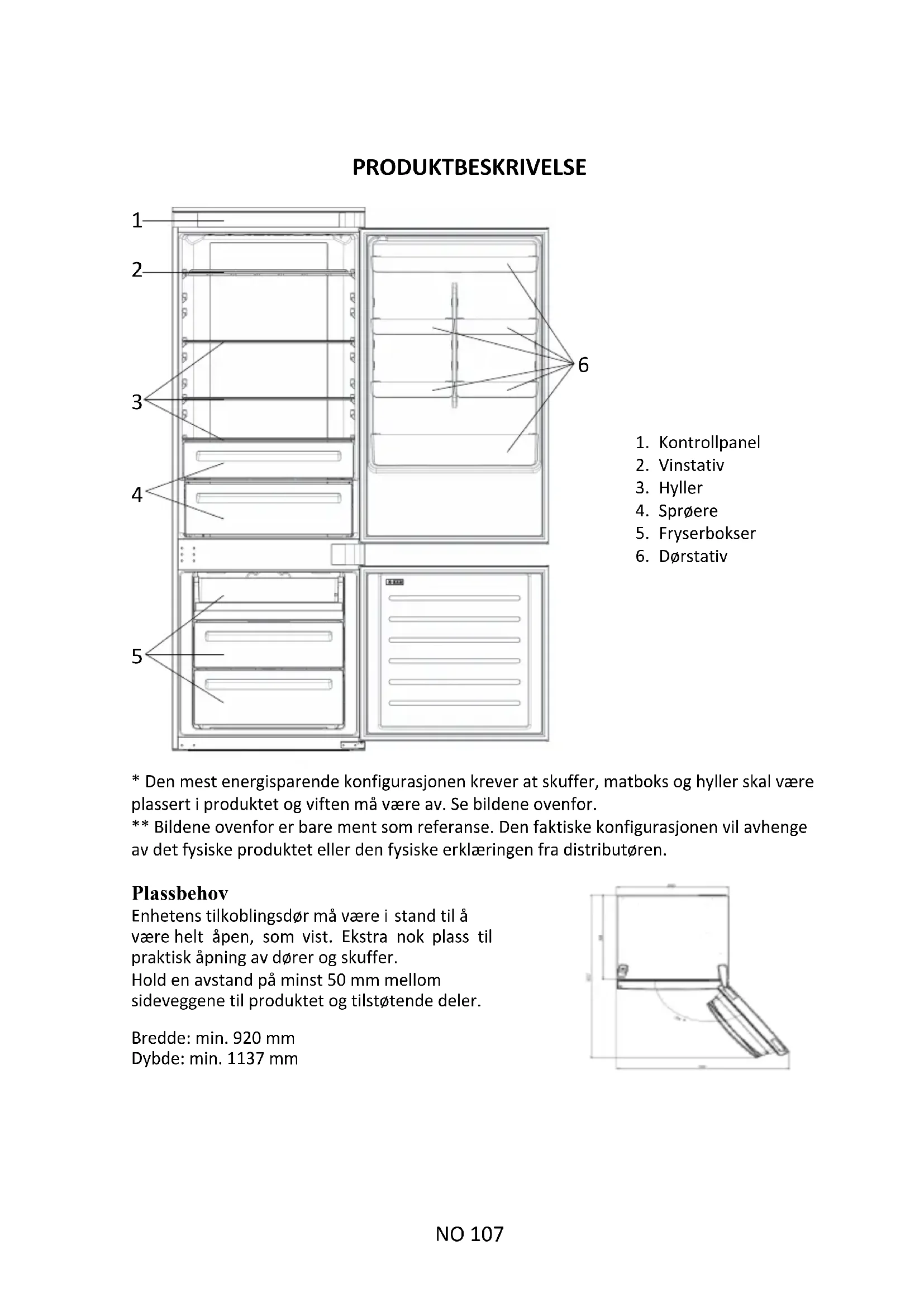 - Den mest energisparende konfigurasjonen krever at skuffer, matboks og hyller skal være plassert i produktet og viften må være av. Se bildene ovenfor. ** Bildene ovenfor er bare ment som referanse. Den faktiske konfigurasjonen vil avhenge av det fysiske produktet eller den fysiske erklæringen fra distributøren. Plassbehov Enhetens tilkoblingsdør må være i stand til å være helt åpen, som vist. Ekstra nok plass til praktisk åpning av dører og skuffer. Hold en avstand på minst 50 mm mellom sideveggene til produktet og tilstøtende deler. Bredde: min. 920 mm Dybde: min. 1137 mm