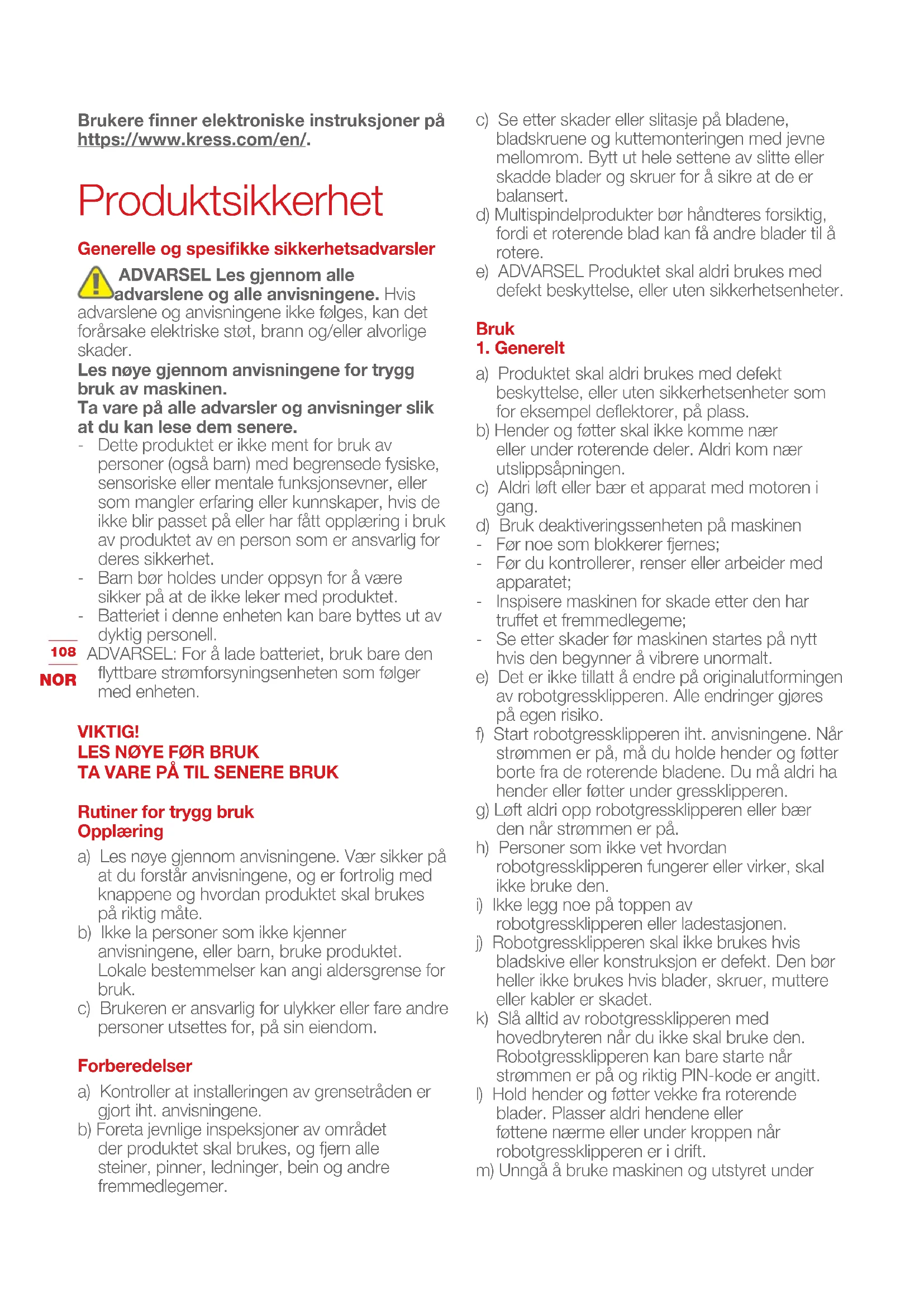 a) Ikke la maskinen gå uten oppsyn hvis du vet at det er kjæledyr, barn eller andre personer i nærheten. Vedlikehold og lagring ADVARSEL! Når klipperen er snudd på hodet, må strømmen alltid være slått av. Strømmen skal være slått av under alt arbeid på klipperen under rammen, for eksempel rengjøring eller bytte av kniver. a) Pass på at alle muttere, bolter og skruer er godt festet slik at produktet kan brukes på en trygg måte. b) Sjekk robotgressklipperen hver uke og bytt ut slitte eller skadde deler, av sikkerhetshensyn. c) Spesielt bladene og bladskiven må sjekkes for skader. Bytt om nødvendig ut alle blader og skruer samtidig, slik at de roterende delene er balansert. d) Kontroller at det bare brukes kuttedeler av riktig type. e) Kontroller at batteriet lades med riktig lader anbefalt av produsenten. Feil bruk kan føre til elektrisk støt, overoppheting eller lekkasje av etsende væske fra batteriet. f) Hvis elektrolytt lekker ut, skyll med vann/ nøytraliserende middel, og oppsøk lege hvis det kommer i kontakt med øynene, osv. g) Service på produktet skal foretas i henhold til produsentens anvisninger. Anbefaling Å koble maskinen og/eller utstyret kun til en strømforsyning som er beskyttet med en jordfeilbryter (RCD) som slår ut ved strøm på mer enn 30 mA. Restrisiko For å unngå skade brukes vernehansker når knivene skiftes. Transport Bruk originalemballasjen når robotgressklipperen skal fraktes over lengre avstander. Slik beveger du deg trygt fra eller innenfor arbeidsområdet: a) Trykk på STOP-tasten for å stoppe gressklipperen. Du velger en firesifret PIN-kode når du starter gressklipperen første gang. b) Slå alltid av robotgressklipperen hvis den skal bæres. c) Gressklipperen skal bæres ved å holde i håndtaket på fronten av den. Bær gressklipperen med bladskiven pekende vekk fra kroppen. RF eksponetingskrav For å tilfredsstille RF-eksponetingskrav, bør en separasjonsavstand på 200mm eller mer opprettholdes mellom denne enheten og personer under enhetsoperasjon. For å sikre overholdelse anbefales ikke operasjoner på nærmere enn denne avstanden. Antennen som brukes til denne senderen, må ikke plasseres sammen med andre antenner eller sendere. Dette er et apparat i klasse III som kun skal forsynes med ekstra lav spenning tilsvarende merkingen på apparatet. Sikkerhetsadvarsler for batteripakke inne i verktøyet a) Ikke demonter, åpne eller riv opp sekundære celler eller batteripakker. b) Ikke kortslutt en celle eller en batteripakke. Ikke oppbevar celler eller batteripakke løst i en boks eller skuff hvor de kan kortslutte hverandre eller bli kortsluttet av andre metallgjenstander. Når batteripakken ikke er i bruk skal den holdes adskilt fra andre metallgjenstander som binders, mynter, nøkler, spiker, skruer eller andre små metallobjekter. Kortslutning av batteriet kan forårsake skader eller brann. c) Ikke utsett celler eller batteripakke for varme eller ild. Unngå oppbevaring i direkte sollys. d) Ikke utsett celler eller batteripakke for mekanisk støt. e) Hvis du opplever cellelekkasje, ikke la væsken komme i kontakt med huden eller øynene. Dersom kontakt har oppstått, vask området med rikelige mengder vann og oppsøk medisinsk hjelp.110 NOR f) Søk medisinsk hjelp umiddelbart hvis en celle eller batteripakke har blitt svelget. g) Hold batteripakken ren og tørr. h) Bruk kun batterilader spesifisert av Kress. Bruk ikke andre ladere enn de som er levert for bruk med utstyret.