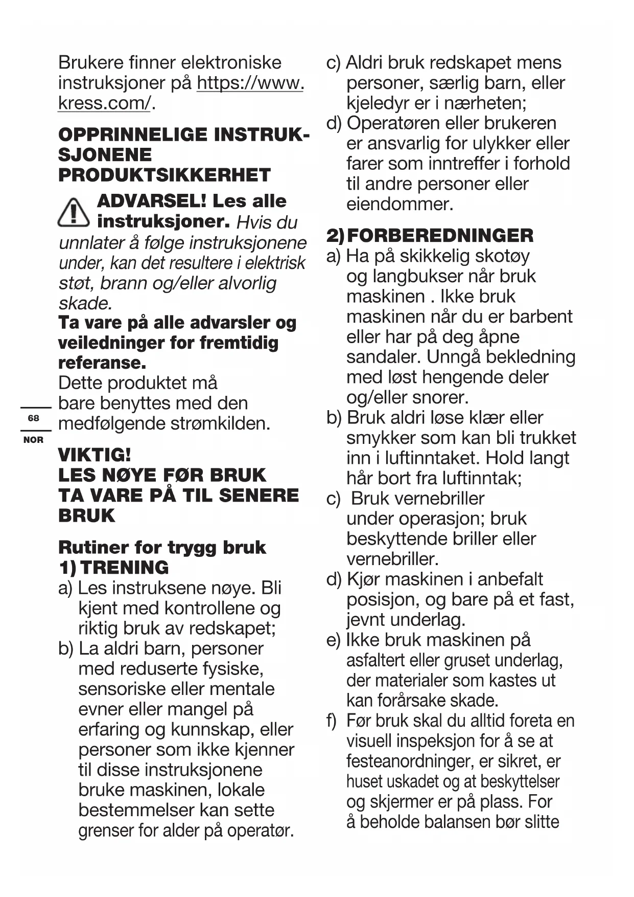 a) Les instruksene nøye. Bli kjent med kontrollene og riktig bruk av redskapet; b) La aldri barn, personer med reduserte fysiske, sensoriske eller mentale evner eller mangel på erfaring og kunnskap, eller personer som ikke kjenner til disse instruksjonene bruke maskinen, lokale bestemmelser kan sette grenser for alder på operatør. c) Aldri bruk redskapet mens personer, særlig barn, eller kjeledyr er i nærheten; d) Operatøren eller brukeren er ansvarlig for ulykker eller farer som inntreffer i forhold til andre personer eller eiendommer.