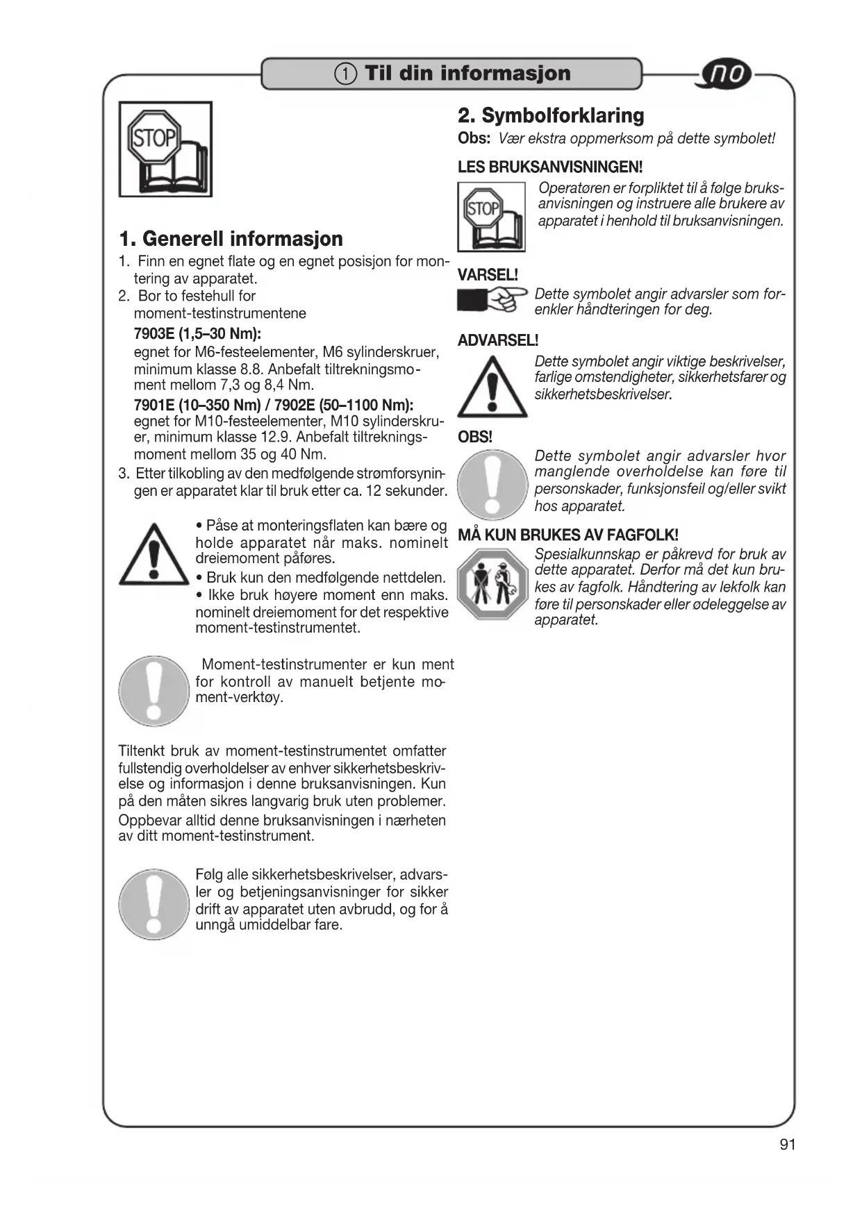 else og informasjon i denne bruksanvisningen. Kun på den måten sikres langvarig bruk uten problemer. Oppbevar alltid denne bruksanvisningen i nærheten av ditt moment-testinstrument. Følg alle sikkerhetsbeskrivelser, advars- ler og betjeningsanvisninger for sikker drift av apparatet uten avbrudd, og for å unngå umiddelbar fare.