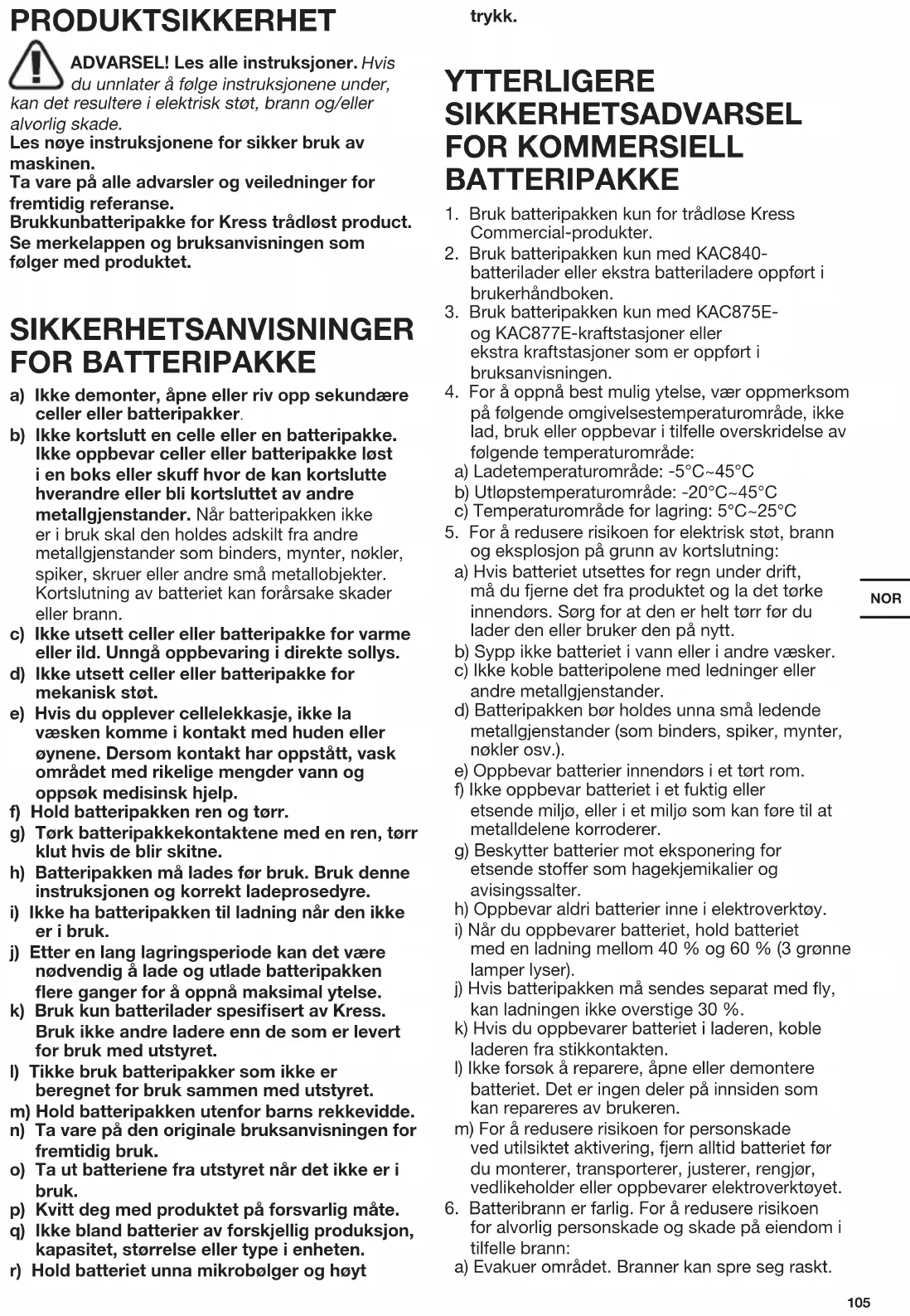 er i bruk. j) Etter en lang lagringsperiode kan det være nødvendig å lade og utlade batteripakken flere ganger for å oppnå maksimal ytelse. k) Bruk kun batterilader spesifisert av Kress. Bruk ikke andre ladere enn de som er levert for bruk med utstyret. l) Tikke bruk batteripakker som ikke er beregnet for bruk sammen med utstyret. m) Hold batteripakken utenfor barns rekkevidde. n) Ta vare på den originale bruksanvisningen for fremtidig bruk. o) Ta ut batteriene fra utstyret når det ikke er i bruk. p) Kvitt deg med produktet på forsvarlig måte. q) Ikke bland batterier av forskjellig produksjon, kapasitet, størrelse eller type i enheten. r) Hold batteriet unna mikrobølger og høyt trykk. YTTERLIGERE SIKKERHETSADVARSEL FOR KOMMERSIELL BATTERIPAKKE