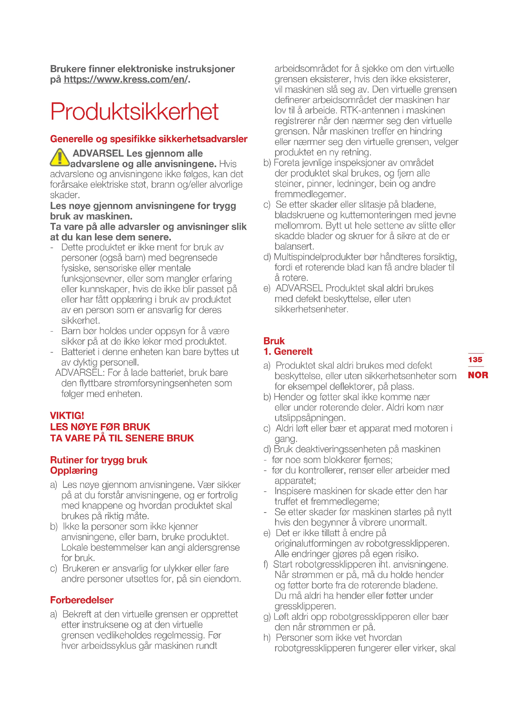 a) Ikke la maskinen gå uten oppsyn hvis du vet at det er kjæledyr, barn eller andre personer i nærheten. b) Sett smarttelefonen på automatisk låsing av skjermen etter 30 s for å forhindre at APP-en blir misbrukt av andre. Vedlikehold og lagring ADVARSEL! Når klipperen er snudd på hodet, må strømmen alltid være slått av. Strømmen skal være slått av under alt arbeid på klipperen under rammen, for eksempel rengjøring eller bytte av kniver. a) Pass på at alle muttere, bolter og skruer er godt festet slik at produktet kan brukes på en trygg måte. b) Sjekk robotgressklipperen hver uke og bytt ut slitte eller skadde deler, av sikkerhetshensyn. c) Spesielt bladene og bladskiven må sjekkes for skader. Bytt om nødvendig ut alle blader og skruer samtidig, slik at de roterende delene er balansert. d) Kontroller at det bare brukes kuttedeler av riktig type. e) Kontroller at batteriet lades med riktig lader anbefalt av produsenten. Feil bruk kan føre til elektrisk støt, overoppheting eller lekkasje av etsende væske fra batteriet. f) Hvis elektrolytt lekker ut, skyll med vann/ nøytraliserende middel, og oppsøk lege hvis det kommer i kontakt med øynene, osv. g) Service på produktet skal foretas i henhold til produsentens anvisninger. Anbefaling Å koble maskinen og/eller utstyret kun til en strømforsyning som er beskyttet med en jordfeilbryter (RCD) som slår ut ved strøm på mer enn 30 mA. Restrisiko For å unngå skade brukes vernehansker når knivene skiftes. Transport Bruk originalemballasjen når robotgressklipperen skal fraktes over lengre avstander. Slik beveger du deg trygt fra eller innenfor arbeidsområdet: a) Trykk på STOP-tasten for å stoppe gressklipperen. Du velger en firesifret PIN-kode når du starter gressklipperen første gang. b) Slå alltid av robotgressklipperen hvis den skal bæres. c) Gressklipperen skal bæres ved å holde i håndtaket på fronten av den. Bær gressklipperen med bladskiven pekende vekk fra kroppen. RF eksponetingskrav For å tilfredsstille RF-eksponetingskrav, bør en separasjonsavstand på 200mm eller mer opprettholdes mellom denne enheten og personer under enhetsoperasjon. For å sikre overholdelse anbefales ikke operasjoner på nærmere enn denne avstanden. Antennen som brukes til denne senderen, må ikke plasseres sammen med andre antenner eller sendere. Dette er et apparat i klasse III som kun skal forsynes med ekstra lav spenning tilsvarende merkingen på apparatet. Sikkerhetsadvarsler for batteripakke inne i verktøyet137 NOR a) Ikke demonter, åpne eller riv opp sekundære celler eller batteripakker. b) Ikke kortslutt en celle eller en batteripakke. Ikke oppbevar celler eller batteripakke løst i en boks eller skuff hvor de kan kortslutte hverandre eller bli kortsluttet av andre metallgjenstander. Når batteripakken ikke er i bruk skal den holdes adskilt fra andre metallgjenstander som binders, mynter, nøkler, spiker, skruer eller andre små metallobjekter. Kortslutning av batteriet kan forårsake skader eller brann. c) Ikke utsett celler eller batteripakke for varme eller ild. Unngå oppbevaring i direkte sollys. d) Ikke utsett celler eller batteripakke for mekanisk støt. e) Hvis du opplever cellelekkasje, ikke la væsken komme i kontakt med huden eller øynene. Dersom kontakt har oppstått, vask området med rikelige mengder vann og oppsøk medisinsk hjelp. f) Hold batteripakken ren og tørr. g) Bruk kun batterilader spesifisert av Kress. Bruk ikke andre ladere enn de som er levert for bruk med utstyret. h) Ikke bruk batteripakker som ikke er beregnet for bruk sammen med utstyret.