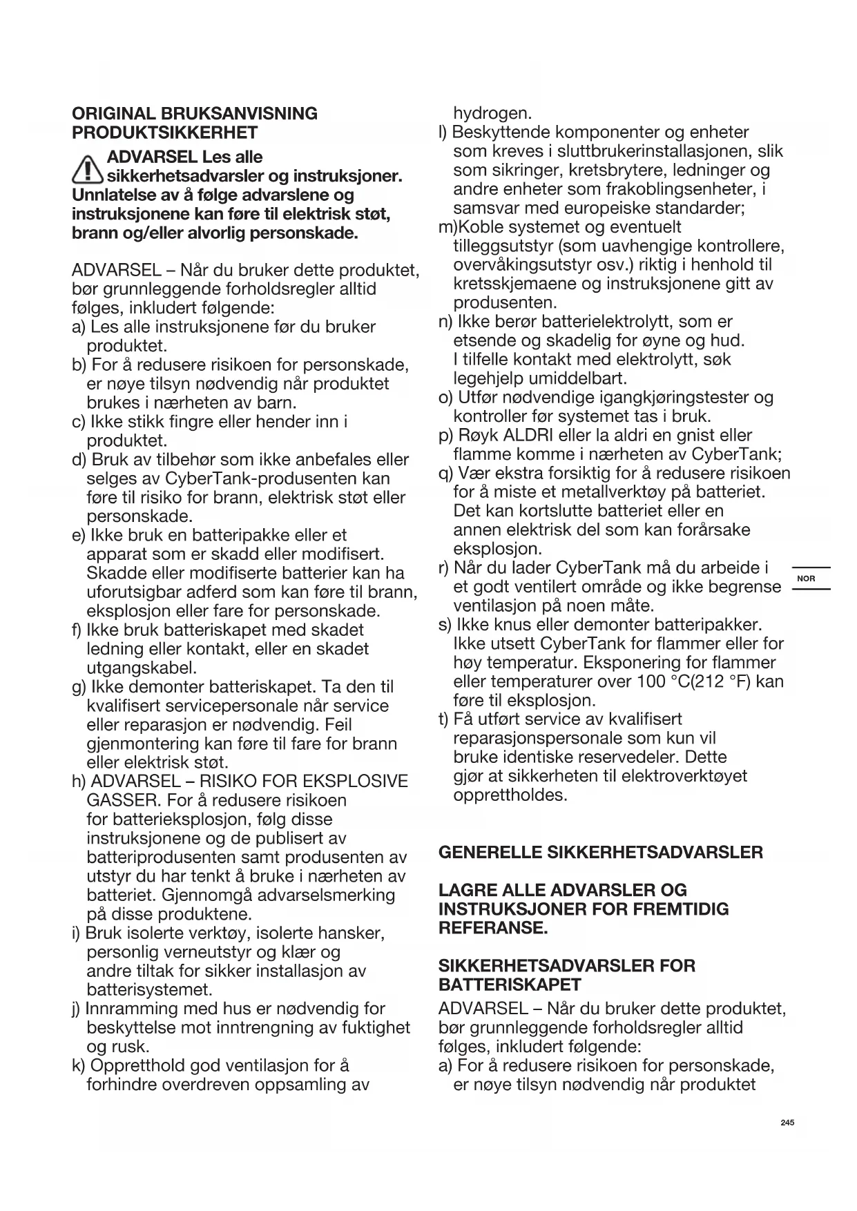 personlig verneutstyr og klær og andre tiltak for sikker installasjon av batterisystemet. j) Innramming med hus er nødvendig for beskyttelse mot inntrengning av fuktighet og rusk. k) Oppretthold god ventilasjon for å forhindre overdreven oppsamling av hydrogen. l) Beskyttende komponenter og enheter som kreves i sluttbrukerinstallasjonen, slik som sikringer, kretsbrytere, ledninger og andre enheter som frakoblingsenheter, i samsvar med europeiske standarder; m)Koble systemet og eventuelt tilleggsutstyr (som uavhengige kontrollere, overvåkingsutstyr osv.) riktig i henhold til kretsskjemaene og instruksjonene gitt av produsenten. n) Ikke berør batterielektrolytt, som er etsende og skadelig for øyne og hud. I tilfelle kontakt med elektrolytt, søk legehjelp umiddelbart. o) Utfør nødvendige igangkjøringstester og kontroller før systemet tas i bruk. p) Røyk ALDRI eller la aldri en gnist eller amme komme i nærheten av CyberTank; q) Vær ekstra forsiktig for å redusere risikoen for å miste et metallverktøy på batteriet. Det kan kortslutte batteriet eller en annen elektrisk del som kan forårsake eksplosjon. r) Når du lader CyberTank må du arbeide i et godt ventilert område og ikke begrense ventilasjon på noen måte. s) Ikke knus eller demonter batteripakker. Ikke utsett CyberTank for ammer eller for høy temperatur. Eksponering for ammer eller temperaturer over 100 °C(212 °F) kan føre til eksplosjon. t) Få utført service av kvalisert reparasjonspersonale som kun vil bruke identiske reservedeler. Dette gjør at sikkerheten til elektroverktøyet opprettholdes. GENERELLE SIKKERHETSADVARSLER