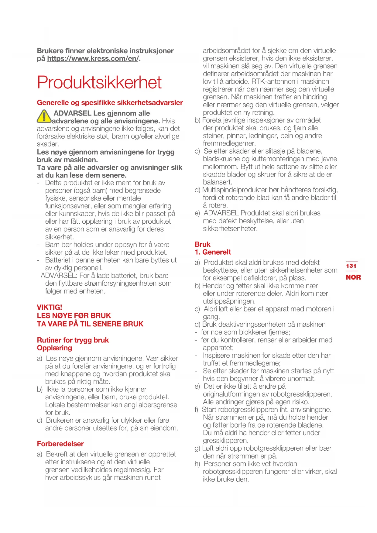 a) Ikke la maskinen gå uten oppsyn hvis du vet at det er kjæledyr, barn eller andre personer i nærheten. b) Sett smarttelefonen på automatisk låsing av skjermen etter 30 s for å forhindre at APP-en blir misbrukt av andre. Vedlikehold og lagring ADVARSEL! Når klipperen er snudd på hodet, må strømmen alltid være slått av. Strømmen skal være slått av under alt arbeid på klipperen under rammen, for eksempel rengjøring eller bytte av kniver. a) Pass på at alle muttere, bolter og skruer er godt festet slik at produktet kan brukes på en trygg måte. b) Sjekk robotgressklipperen hver uke og bytt ut slitte eller skadde deler, av sikkerhetshensyn. c) Spesielt bladene og bladskiven må sjekkes for skader. Bytt om nødvendig ut alle blader og skruer samtidig, slik at de roterende delene er balansert. d) Kontroller at det bare brukes kuttedeler av riktig type. e) Kontroller at batteriet lades med riktig lader anbefalt av produsenten. Feil bruk kan føre til elektrisk støt, overoppheting eller lekkasje av etsende væske fra batteriet. f) Hvis elektrolytt lekker ut, skyll med vann/ nøytraliserende middel, og oppsøk lege hvis det kommer i kontakt med øynene, osv. g) Service på produktet skal foretas i henhold til produsentens anvisninger. Anbefaling Å koble maskinen og/eller utstyret kun til en strømforsyning som er beskyttet med en jordfeilbryter (RCD) som slår ut ved strøm på mer enn 30 mA. Restrisiko For å unngå skade brukes vernehansker når knivene skiftes. Transport Bruk originalemballasjen når robotgressklipperen skal fraktes over lengre avstander. Slik beveger du deg trygt fra eller innenfor arbeidsområdet: a) Trykk på STOP-tasten for å stoppe gressklipperen. Du velger en firesifret PIN-kode når du starter gressklipperen første gang. b) Slå alltid av robotgressklipperen hvis den skal bæres. c) Gressklipperen skal bæres ved å holde i håndtaket på fronten av den. Bær gressklipperen med bladskiven pekende vekk fra kroppen. RF eksponetingskrav For å tilfredsstille RF-eksponetingskrav, bør en separasjonsavstand på 200mm eller mer opprettholdes mellom denne enheten og personer under enhetsoperasjon. For å sikre overholdelse anbefales ikke operasjoner på nærmere enn denne avstanden. Antennen som brukes til denne senderen, må ikke plasseres sammen med andre antenner eller sendere. Dette er et apparat i klasse III som kun skal forsynes med ekstra lav spenning tilsvarende merkingen på apparatet. Sikkerhetsadvarsler for batteripakke inne i verktøyet a) Ikke demonter, åpne eller riv opp133 NOR sekundære celler eller batteripakker. b) Ikke kortslutt en celle eller en batteripakke. Ikke oppbevar celler eller batteripakke løst i en boks eller skuff hvor de kan kortslutte hverandre eller bli kortsluttet av andre metallgjenstander. Når batteripakken ikke er i bruk skal den holdes adskilt fra andre metallgjenstander som binders, mynter, nøkler, spiker, skruer eller andre små metallobjekter. Kortslutning av batteriet kan forårsake skader eller brann. c) Ikke utsett celler eller batteripakke for varme eller ild. Unngå oppbevaring i direkte sollys. d) Ikke utsett celler eller batteripakke for mekanisk støt. e) Hvis du opplever cellelekkasje, ikke la væsken komme i kontakt med huden eller øynene. Dersom kontakt har oppstått, vask området med rikelige mengder vann og oppsøk medisinsk hjelp. f) Hold batteripakken ren og tørr. g) Bruk kun batterilader spesifisert av Kress. Bruk ikke andre ladere enn de som er levert for bruk med utstyret. h) Ikke bruk batteripakker som ikke er beregnet for bruk sammen med utstyret.