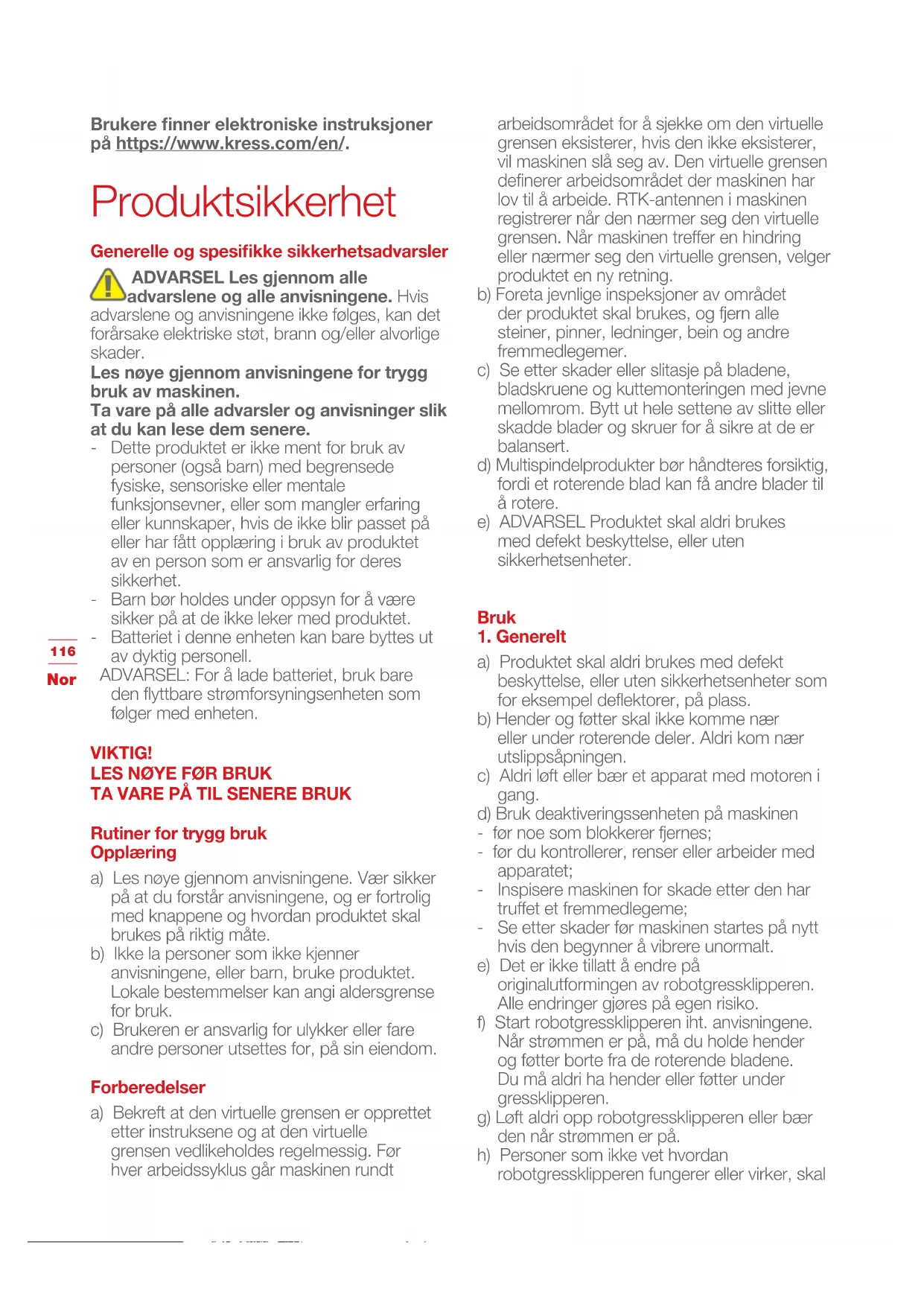 a) Ikke la maskinen gå uten oppsyn hvis du vet at det er kjæledyr, barn eller andre personer i nærheten. Vedlikehold og lagring ADVARSEL! Når klipperen er snudd på hodet, må strømmen alltid være slått av. Strømmen skal være slått av under alt arbeid på klipperen under rammen, for eksempel rengjøring eller bytte av kniver. a) Pass på at alle muttere, bolter og skruer er godt festet slik at produktet kan brukes på en trygg måte. b) Sjekk robotgressklipperen hver uke og bytt ut slitte eller skadde deler, av sikkerhetshensyn. c) Spesielt bladene og bladskiven må sjekkes for skader. Bytt om nødvendig ut alle blader og skruer samtidig, slik at de roterende delene er balansert. d) Kontroller at det bare brukes kuttedeler av riktig type. e) Kontroller at batteriet lades med riktig lader anbefalt av produsenten. Feil bruk kan føre til elektrisk støt, overoppheting eller lekkasje av etsende væske fra batteriet. f) Hvis elektrolytt lekker ut, skyll med vann/ nøytraliserende middel, og oppsøk lege hvis det kommer i kontakt med øynene, osv. g) Service på produktet skal foretas i henhold til produsentens anvisninger. Anbefaling Å koble maskinen og/eller utstyret kun til en strømforsyning som er beskyttet med en jordfeilbryter (RCD) som slår ut ved strøm på mer enn 30 mA. Restrisiko For å unngå skade brukes vernehansker når knivene skiftes. Transport Bruk originalemballasjen når robotgressklipperen skal fraktes over lengre avstander. Slik beveger du deg trygt fra eller innenfor arbeidsområdet: a) Trykk på STOP-tasten for å stoppe gressklipperen. Du velger en firesifret PIN-kode når du starter gressklipperen første gang. b) Slå alltid av robotgressklipperen hvis den skal bæres. c) Gressklipperen skal bæres ved å holde i håndtaket på fronten av den. Bær gressklipperen med bladskiven pekende vekk fra kroppen. RF eksponetingskrav For å tilfredsstille RF-eksponetingskrav, bør en separasjonsavstand på 200mm eller mer opprettholdes mellom denne enheten og personer under enhetsoperasjon. For å sikre overholdelse anbefales ikke operasjoner på nærmere enn denne avstanden. Antennen som brukes til denne senderen, må ikke plasseres sammen med andre antenner eller sendere. Dette er et apparat i klasse III som kun skal forsynes med ekstra lav spenning tilsvarende merkingen på apparatet. Sikkerhetsadvarsler for batteripakke inne i verktøyet a) Ikke demonter, åpne eller riv opp sekundære celler eller batteripakker. b) Ikke kortslutt en celle eller en batteripakke. Ikke oppbevar celler eller batteripakke løst i en boks eller skuff hvor de kan kortslutte hverandre eller bli kortsluttet av andre metallgjenstander.118 Nor Når batteripakken ikke er i bruk skal den holdes adskilt fra andre metallgjenstander som binders, mynter, nøkler, spiker, skruer eller andre små metallobjekter. Kortslutning av batteriet kan forårsake skader eller brann. c) Ikke utsett celler eller batteripakke for varme eller ild. Unngå oppbevaring i direkte sollys. d) Ikke utsett celler eller batteripakke for mekanisk støt. e) Hvis du opplever cellelekkasje, ikke la væsken komme i kontakt med huden eller øynene. Dersom kontakt har oppstått, vask området med rikelige mengder vann og oppsøk medisinsk hjelp. f) Hold batteripakken ren og tørr. g) Bruk kun batterilader spesifisert av Kress. Bruk ikke andre ladere enn de som er levert for bruk med utstyret. h) Ikke bruk batteripakker som ikke er beregnet for bruk sammen med utstyret.