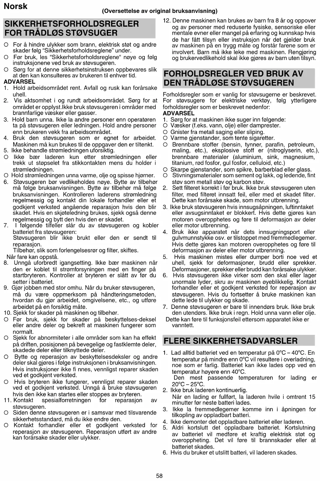 unormale lyder, skru av maskinen øyeblikkelig. Kontakt forhandler eller et godkjent verksted for reperasjon av støvsugeren. Hvis du fortsetter å bruke maskinen kan dette lede til ulykker og skade.