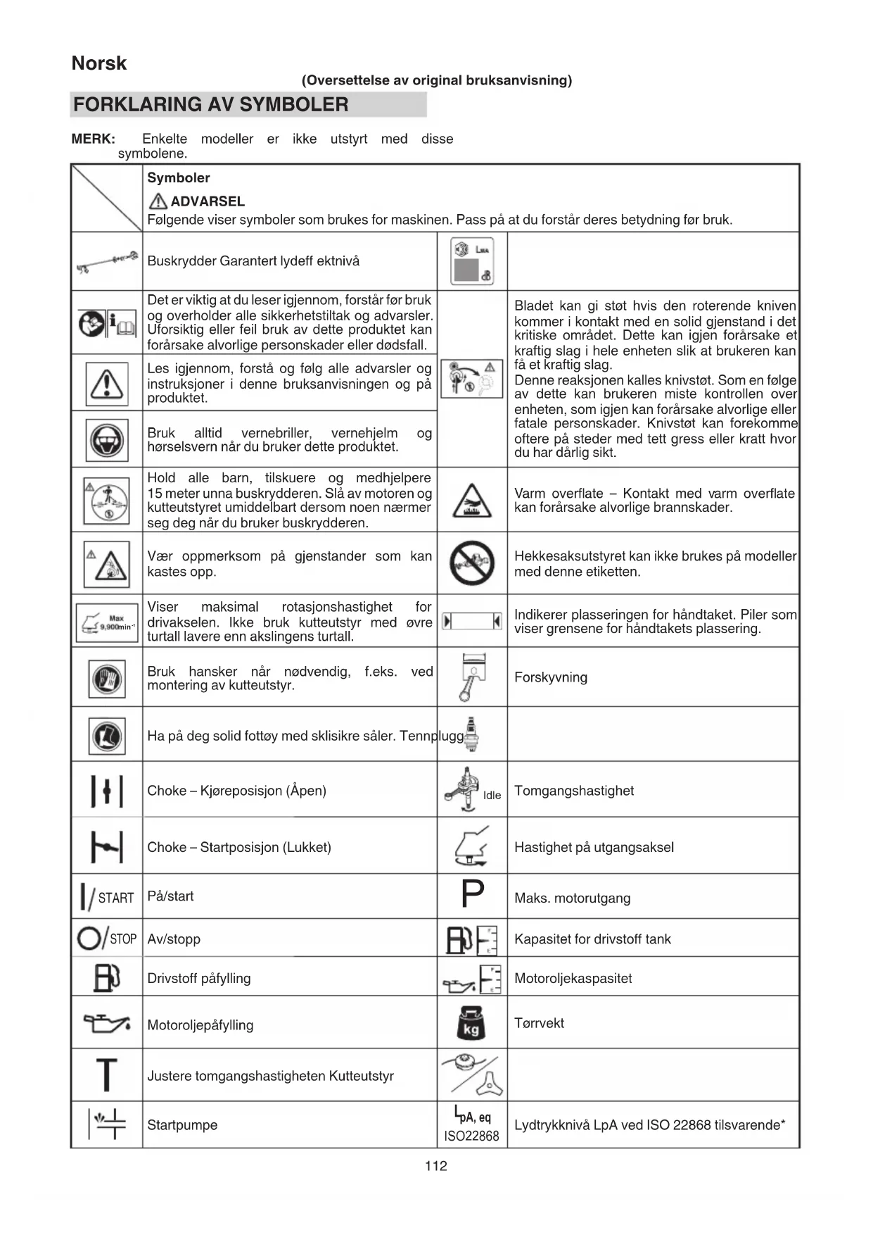Viser maksimal rotasjonshastighet for drivakselen. Ikke bruk kutteutstyr med øvre turtall lavere enn akslingens turtall. Indikerer plasseringen for håndtaket. Piler som viser grensene for håndtakets plassering. Bruk hansker når nødvendig, f.eks. ved montering av kutteutstyr. Forskyvning Ha på deg solid fottøy med sklisikre såler. Tennplugg Choke – Kjøreposisjon (Åpen) Idle Tomgangshastighet Choke – Startposisjon (Lukket) Hastighet på utgangsaksel START På/start
