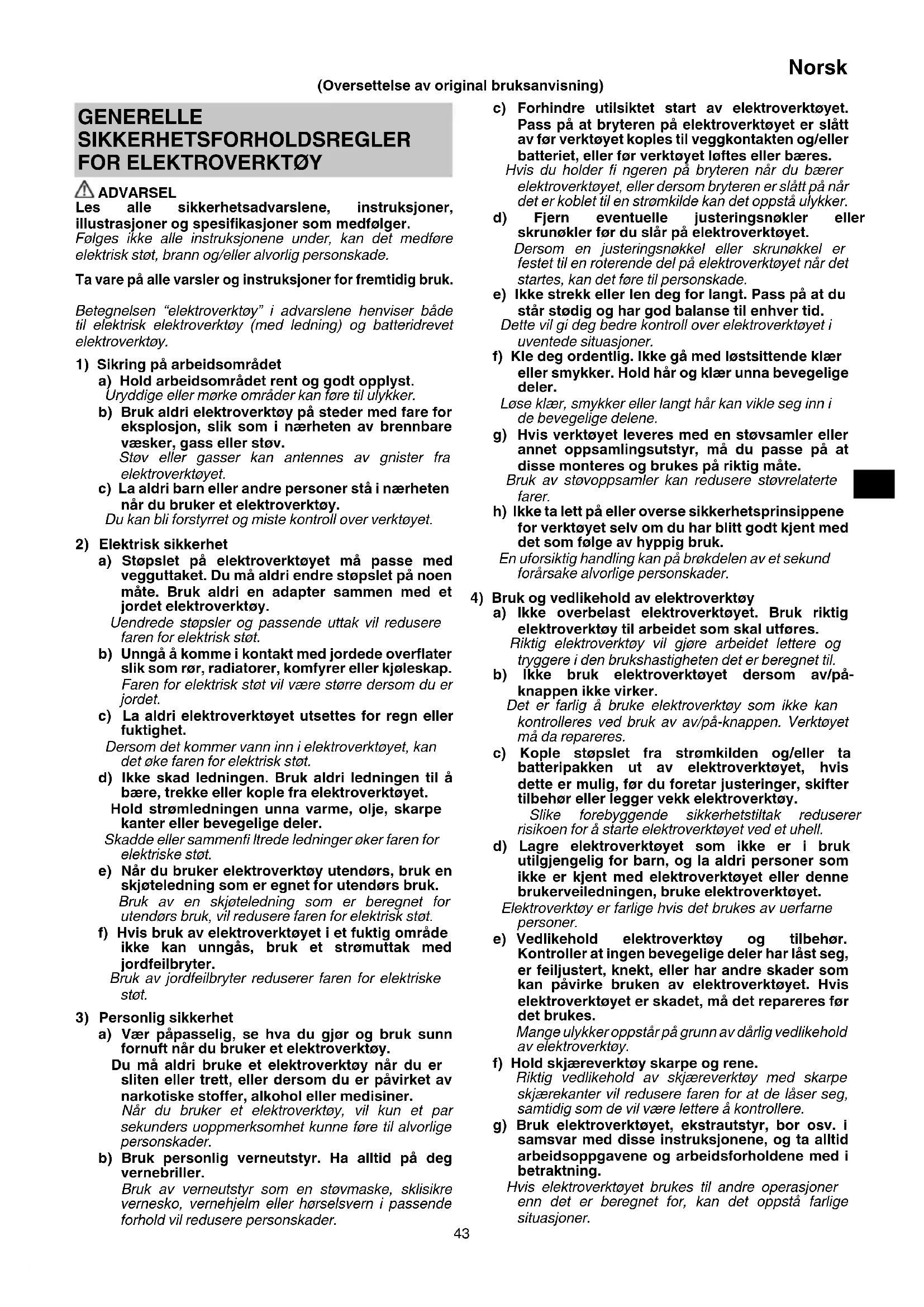 a) Ikke overbelast elektroverktøyet. Bruk riktig elektroverktøy til arbeidet som skal utføres. Riktig elektroverktøy vil gjøre arbeidet lettere og tryggere i den brukshastigheten det er beregnet til. b) Ikke bruk elektroverktøyet dersom av/på- knappen ikke virker. Det er farlig å bruke elektroverktøy som ikke kan kontrolleres ved bruk av av/på-knappen. Verktøyet må da repareres. c) Kople støpslet fra strømkilden og/eller ta batteripakken ut av elektroverktøyet, hvis dette er mulig, før du foretar justeringer, skifter tilbehør eller legger vekk elektroverktøy. Slike forebyggende sikkerhetstiltak reduserer risikoen for å starte elektroverktøyet ved et uhell. d) Lagre elektroverktøyet som ikke er i bruk utilgjengelig for barn, og la aldri personer som ikke er kjent med elektroverktøyet eller denne brukerveiledningen, bruke elektroverktøyet. Elektroverktøy er farlige hvis det brukes av uerfarne personer. e) Vedlikehold elektroverktøy og tilbehør. Kontroller at ingen bevegelige deler har låst seg, er feiljustert, knekt, eller har andre skader som kan påvirke bruken av elektroverktøyet. Hvis elektroverktøyet er skadet, må det repareres før det brukes. Mange ulykker oppstår på grunn av dårlig vedlikehold av elektroverktøy. f) Hold skjæreverktøy skarpe og rene. Riktig vedlikehold av skjæreverktøy med skarpe skjærekanter vil redusere faren for at de låser seg, samtidig som de vil være lettere å kontrollere. g) Bruk elektroverktøyet, ekstrautstyr, bor osv. i samsvar med disse instruksjonene, og ta alltid arbeidsoppgavene og arbeidsforholdene med i betraktning. Hvis elektroverktøyet brukes til andre operasjoner enn det er beregnet for, kan det oppstå farlige situasjoner. GENERELLE SIKKERHETSFORHOLDSREGLER