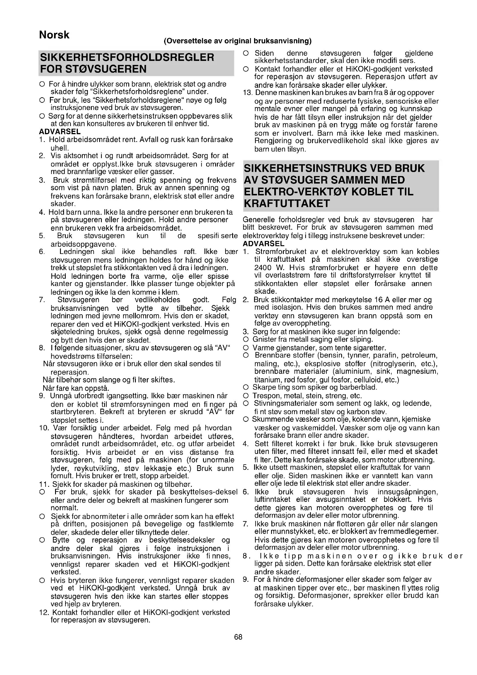 KRAFTUTTAKET Generelle forholdsregler ved bruk av støvsugeren har blitt beskrevet. For bruk av støvsugeren sammen med elektroverktøy følg i tillegg instruksene beskrevet under: ADVARSEL