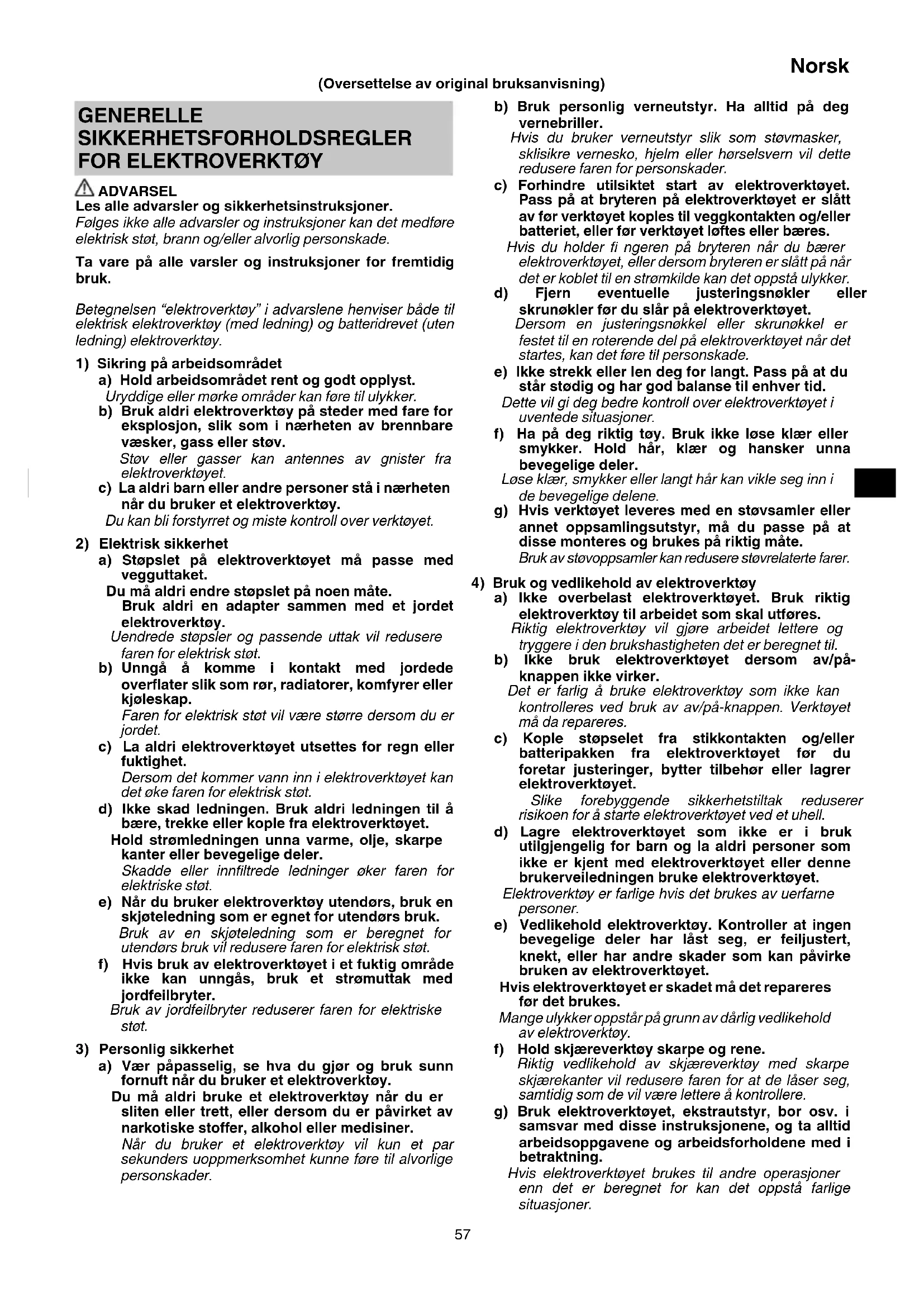 ADVARSEL Les alle advarsler og sikkerhetsinstruksjoner. Følges ikke alle advarsler og instruksjoner kan det medføre elektrisk støt, brann og/eller alvorlig personskade. Ta vare på alle varsler og instruksjoner for fremtidig bruk. Betegnelsen “elektroverktøy” i advarslene henviser både til elektrisk elektroverktøy (med ledning) og batteridrevet (uten ledning) elektroverktøy.