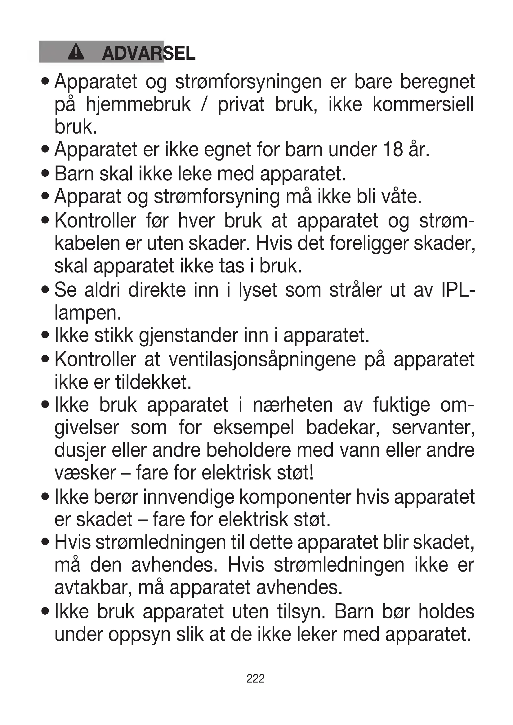 Ikke bruk apparatet uten tilsyn. Barn bør holdes under oppsyn slik at de ikke leker med apparatet.223