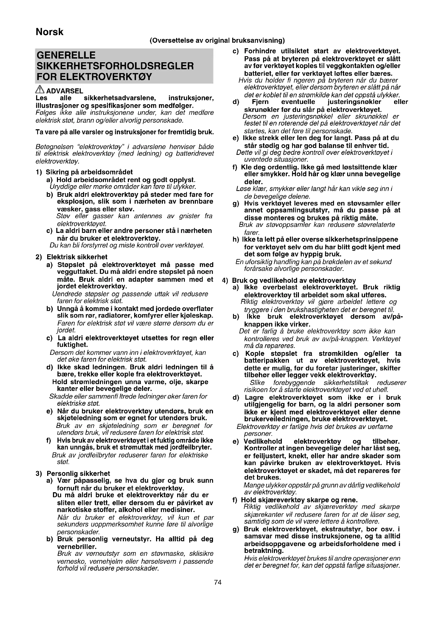a) Ikke overbelast elektroverktøyet. Bruk riktig elektroverktøy til arbeidet som skal utføres. Riktig elektroverktøy vil gjøre arbeidet lettere og tryggere i den brukshastigheten det er beregnet til. b) Ikke bruk elektroverktøyet dersom av/på- knappen ikke virker. Det er farlig å bruke elektroverktøy som ikke kan kontrolleres ved bruk av av/på-knappen. Verktøyet må da repareres. c) Kople støpslet fra strømkilden og/eller ta batteripakken ut av elektroverktøyet, hvis dette er mulig, før du foretar justeringer, skifter tilbehør eller legger vekk elektroverktøy. Slike forebyggende sikkerhetstiltak reduserer risikoen for å starte elektroverktøyet ved et uhell. d) Lagre elektroverktøyet som ikke er i bruk utilgjengelig for barn, og la aldri personer som ikke er kjent med elektroverktøyet eller denne brukerveiledningen, bruke elektroverktøyet. Elektroverktøy er farlige hvis det brukes av uerfarne personer. e) Vedlikehold elektroverktøy og tilbehør. Kontroller at ingen bevegelige deler har låst seg, er feiljustert, knekt, eller har andre skader som kan påvirke bruken av elektroverktøyet. Hvis elektroverktøyet er skadet, må det repareres før det brukes. Mange ulykker oppstår på grunn av dårlig vedlikehold av elektroverktøy. f) Hold skjæreverktøy skarpe og rene. Riktig vedlikehold av skjæreverktøy med skarpe skjærekanter vil redusere faren for at de låser seg, samtidig som de vil være lettere å kontrollere. g) Bruk elektroverktøyet, ekstrautstyr, bor osv. i samsvar med disse instruksjonene, og ta alltid arbeidsoppgavene og arbeidsforholdene med i betraktning. Hvis elektroverktøyet brukes til andre operasjoner enn det er beregnet for, kan det oppstå farlige situasjoner. GENERELLE SIKKERHETSFORHOLDSREGLER