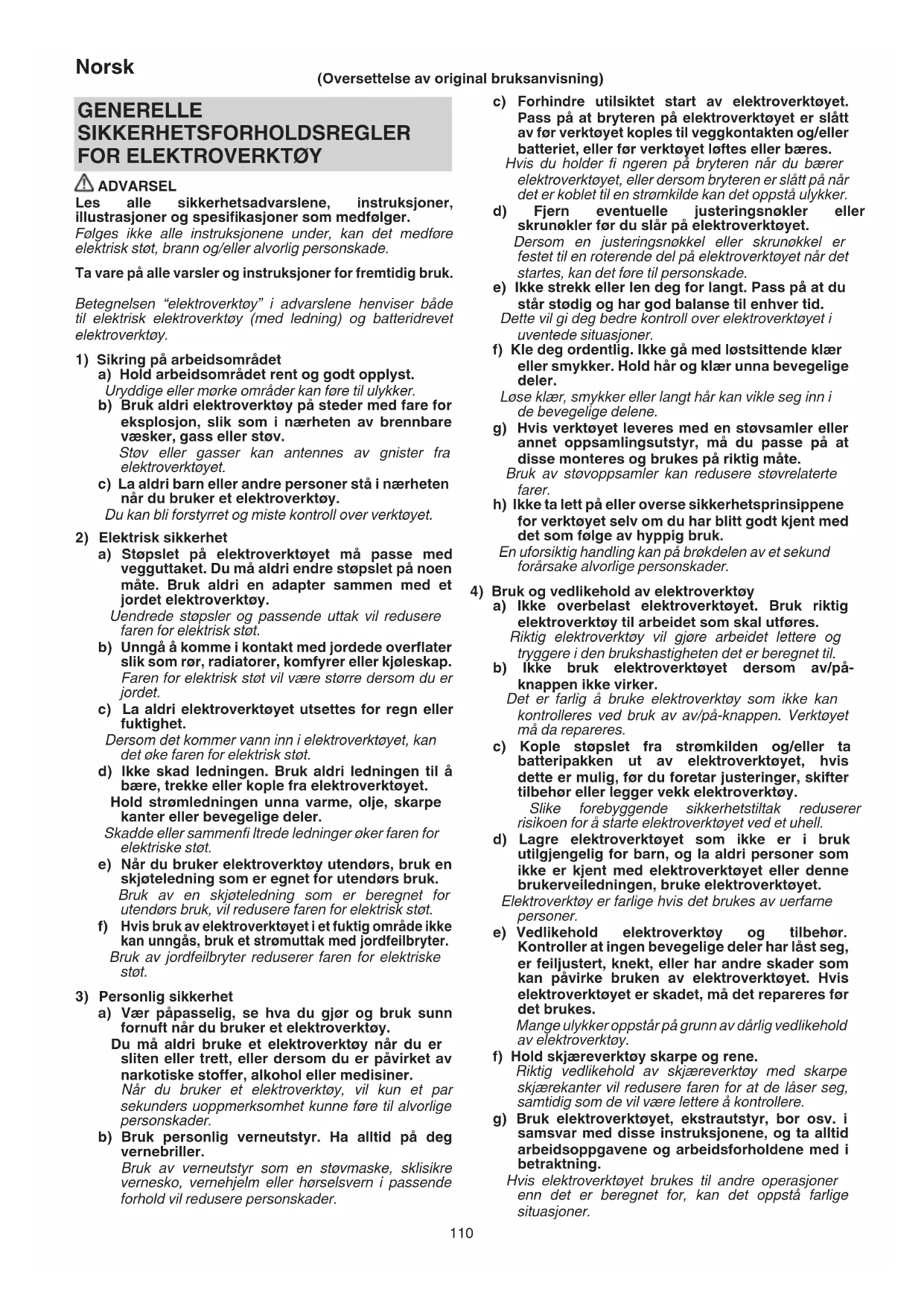 ADVARSEL Les alle sikkerhetsadvarslene, instruksjoner, illustrasjoner og spesifi kasjoner som medfølger. Følges ikke alle instruksjonene under, kan det medføre elektrisk støt, brann og/eller alvorlig personskade. Ta vare på alle varsler og instruksjoner for fremtidig bruk. Betegnelsen “elektroverktøy” i advarslene henviser både til elektrisk elektroverktøy (med ledning) og batteridrevet elektroverktøy.