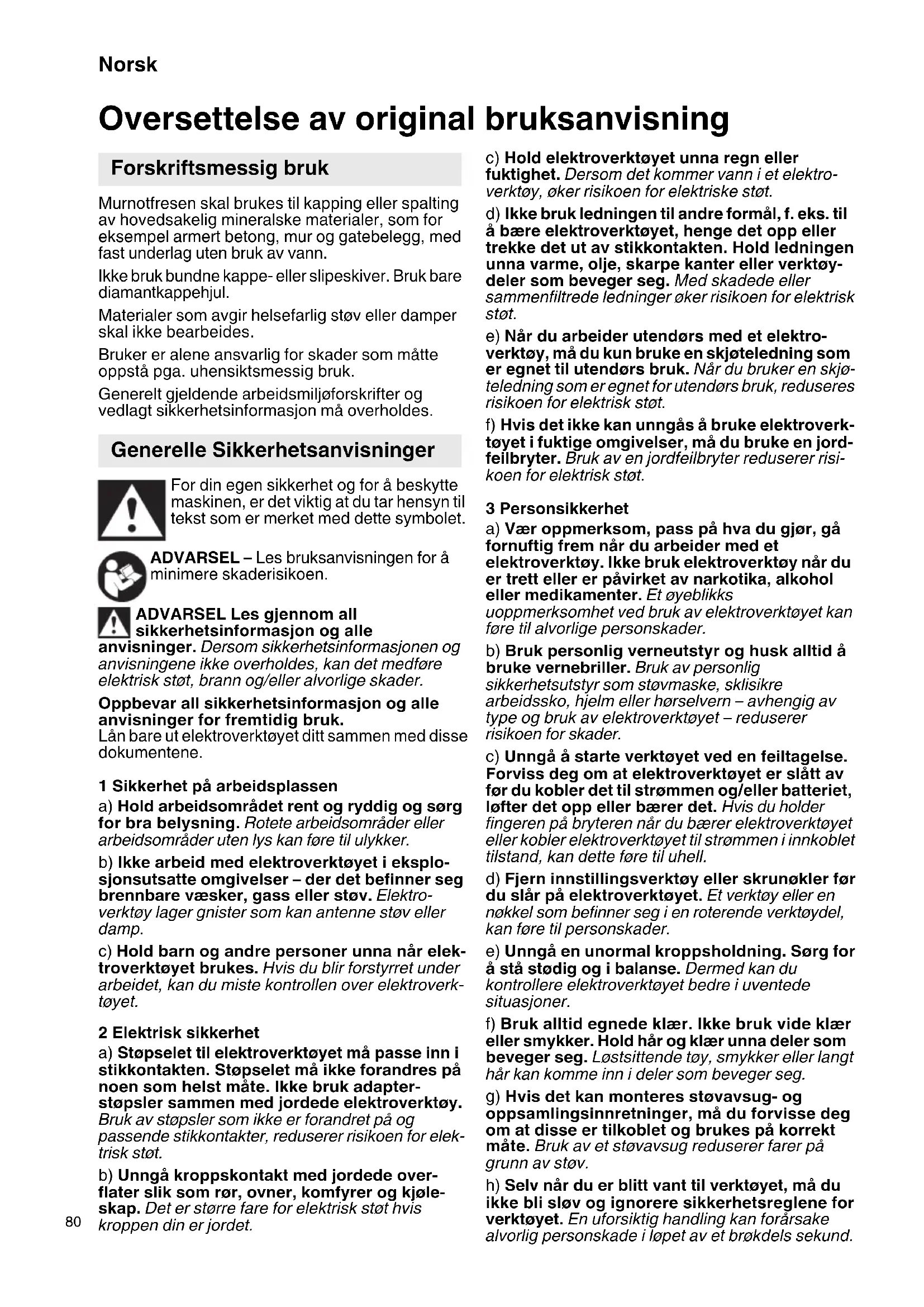 Oversettelse av original bruksanvisning Murnotfresen skal brukes til kapping eller spalting av hovedsakelig mineralske materialer, som for eksempel armert betong, mur og gatebelegg, med fast underlag uten bruk av vann. Ikke bruk bundne kappe- eller slipeskiver. Bruk bare diamantkappehjul. Materialer som avgir helsefarlig støv eller damper skal ikke bearbeides. Bruker er alene ansvarlig for skader som måtte oppstå pga. uhensiktsmessig bruk. Generelt gjeldende arbeidsmiljøforskrifter og vedlagt sikkerhetsinformasjon må overholdes. For din egen sikkerhet og for å beskytte maskinen, er det viktig at du tar hensyn til tekst som er merket med dette symbolet. ADVARSEL – Les bruksanvisningen for å minimere skaderisikoen. ADVARSEL Les gjennom all sikkerhetsinformasjon og alle anvisninger. Dersom sikkerhetsinformasjonen og anvisningene ikke overholdes, kan det medføre elektrisk støt, brann og/eller alvorlige skader. Oppbevar all sikkerhetsinformasjon og alle anvisninger for fremtidig bruk. Lån bare ut elektroverktøyet ditt sammen med disse dokumentene. 1 Sikkerhet på arbeidsplassen a) Hold arbeidsområdet rent og ryddig og sørg for bra belysning. Rotete arbeidsområder eller arbeidsområder uten lys kan føre til ulykker. b) Ikke arbeid med elektroverktøyet i eksplo- sjonsutsatte omgivelser – der det befinner seg brennbare væsker, gass eller støv. Elektro- verktøy lager gnister som kan antenne støv eller damp. c) Hold barn og andre personer unna når elek- troverktøyet brukes. Hvis du blir forstyrret under arbeidet, kan du miste kontrollen over elektroverk- tøyet. 2 Elektrisk sikkerhet a) Støpselet til elektroverktøyet må passe inn i stikkontakten. Støpselet må ikke forandres på noen som helst måte. Ikke bruk adapter- støpsler sammen med jordede elektroverktøy. Bruk av støpsler som ikke er forandret på og passende stikkontakter, reduserer risikoen for elek- trisk støt. b) Unngå kroppskontakt med jordede over- flater slik som rør, ovner, komfyrer og kjøle- skap. Det er større fare for elektrisk støt hvis kroppen din er jordet. c) Hold elektroverktøyet unna regn eller fuktighet. Dersom det kommer vann i et elektro- verktøy, øker risikoen for elektriske støt. d) Ikke bruk ledningen til andre formål, f. eks. til å bære elektroverktøyet, henge det opp eller trekke det ut av stikkontakten. Hold ledningen unna varme, olje, skarpe kanter eller verktøy- deler som beveger seg. Med skadede eller sammenfiltrede ledninger øker risikoen for elektrisk støt. e) Når du arbeider utendørs med et elektro- verktøy, må du kun bruke en skjøteledning som er egnet til utendørs bruk. Når du bruker en skjø- teledning som er egnet for utendørs bruk, reduseres risikoen for elektrisk støt. f) Hvis det ikke kan unngås å bruke elektroverk- tøyet i fuktige omgivelser, må du bruke en jord- feilbryter. Bruk av en jordfeilbryter reduserer risi- koen for elektrisk støt. 3 Personsikkerhet a) Vær oppmerksom, pass på hva du gjør, gå fornuftig frem når du arbeider med et elektroverktøy. Ikke bruk elektroverktøy når du er trett eller er påvirket av narkotika, alkohol eller medikamenter. Et øyeblikks uoppmerksomhet ved bruk av elektroverktøyet kan føre til alvorlige personskader. b) Bruk personlig verneutstyr og husk alltid å bruke vernebriller. Bruk av personlig sikkerhetsutstyr som støvmaske, sklisikre arbeidssko, hjelm eller hørselvern – avhengig av type og bruk av elektroverktøyet – reduserer risikoen for skader. c) Unngå å starte verktøyet ved en feiltagelse. Forviss deg om at elektroverktøyet er slått av før du kobler det til strømmen og/eller batteriet, løfter det opp eller bærer det. Hvis du holder fingeren på bryteren når du bærer elektroverktøyet eller kobler elektroverktøyet til strømmen i innkoblet tilstand, kan dette føre til uhell. d) Fjern innstillingsverktøy eller skrunøkler før du slår på elektroverktøyet. Et verktøy eller en nøkkel som befinner seg i en roterende verktøydel, kan føre til personskader. e) Unngå en unormal kroppsholdning. Sørg for å stå stødig og i balanse. Dermed kan du kontrollere elektroverktøyet bedre i uventede situasjoner. f) Bruk alltid egnede klær. Ikke bruk vide klær eller smykker. Hold hår og klær unna deler som beveger seg. Løstsittende tøy, smykker eller langt hår kan komme inn i deler som beveger seg. g) Hvis det kan monteres støvavsug- og oppsamlingsinnretninger, må du forvisse deg om at disse er tilkoblet og brukes på korrekt måte. Bruk av et støvavsug reduserer farer på grunn av støv. h) Selv når du er blitt vant til verktøyet, må du ikke bli sløv og ignorere sikkerhetsreglene for verktøyet. En uforsiktig handling kan forårsake alvorlig personskade i løpet av et brøkdels sekund. Forskriftsmessig bruk Generelle Sikkerhetsanvisninger 000book_CM5MA.book 80 ページ 2022年7月20日 水曜日 午後4時50分Norsk