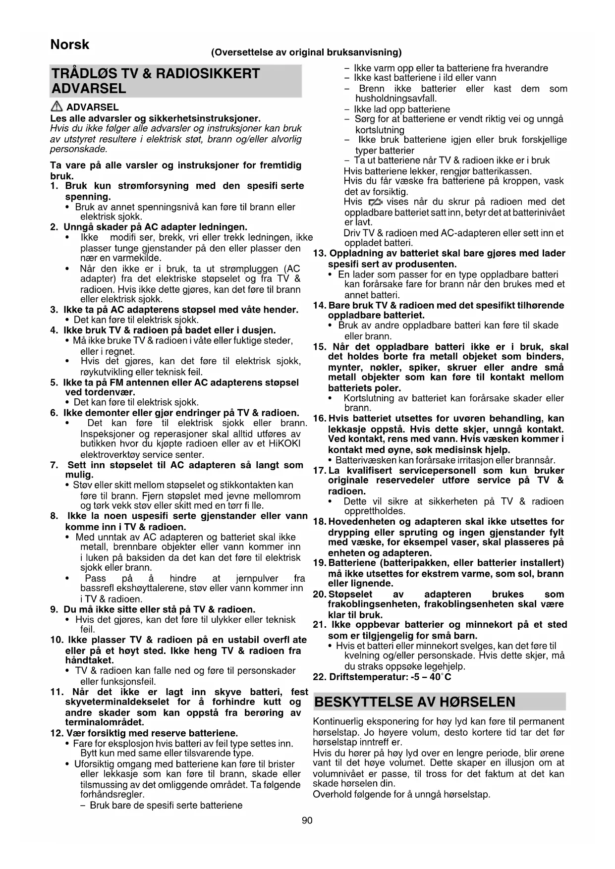 - Uforsiktig omgang med batteriene kan føre til brister eller lekkasje som kan føre til brann, skade eller tilsmussing av det omliggende området. Ta følgende forhåndsregler. – Bruk bare de spesifi serte batteriene – Ikke varm opp eller ta batteriene fra hverandre – Ikke kast batteriene i ild eller vann – Brenn ikke batterier eller kast dem som husholdningsavfall. – Ikke lad opp batteriene – Sørg for at batteriene er vendt riktig vei og unngå kortslutning – Ikke bruk batteriene igjen eller bruk forskjellige typer batterier – Ta ut batteriene når TV & radioen ikke er i bruk Hvis batteriene lekker, rengjør batterikassen. Hvis du får væske fra batteriene på kroppen, vask det av forsiktig. Hvis vises når du skrur på radioen med det oppladbare batteriet satt inn, betyr det at batterinivået er lavt. Driv TV & radioen med AC-adapteren eller sett inn et oppladet batteri.