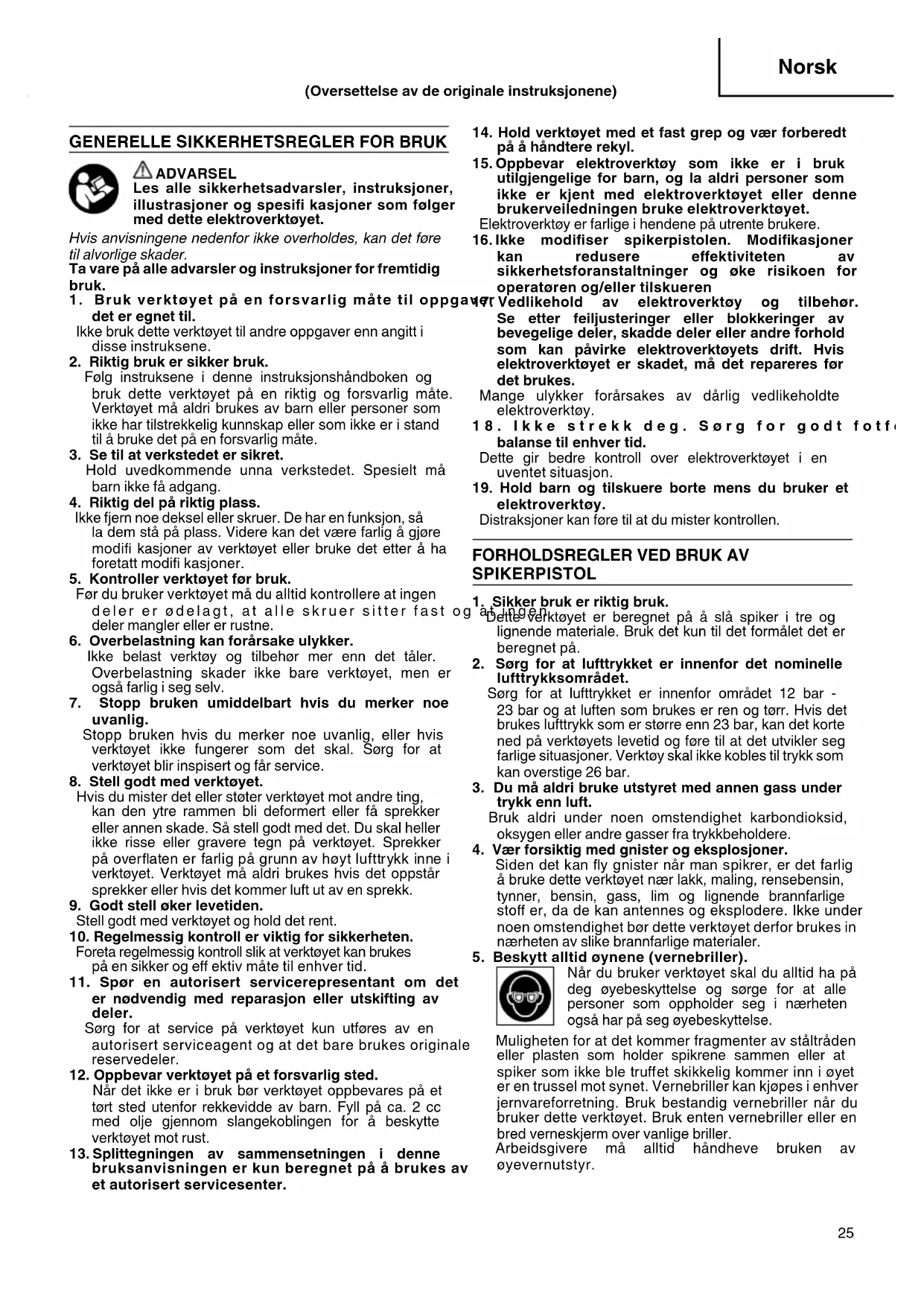 ADVARSEL Bruk en kompressor som er konstruert til høytrykksbruk. Lufttrykket må holdes konstant på 12 – 23 bar. Reguler lufttrykket mellom 12 og 23 bar avhengig av diameteren og lengden på spikrene og hvor hardt treverket er som det spikres i. Vær spesielt oppmerksom på utgangstrykket, kapasitet og rørene på luftkompressoren, slik at lufttrykket ikke overstiger den spesifi serte grensen. Merk deg at overtrykk kan påvirke den generelle ytelsen, levetiden og sikkerheten.