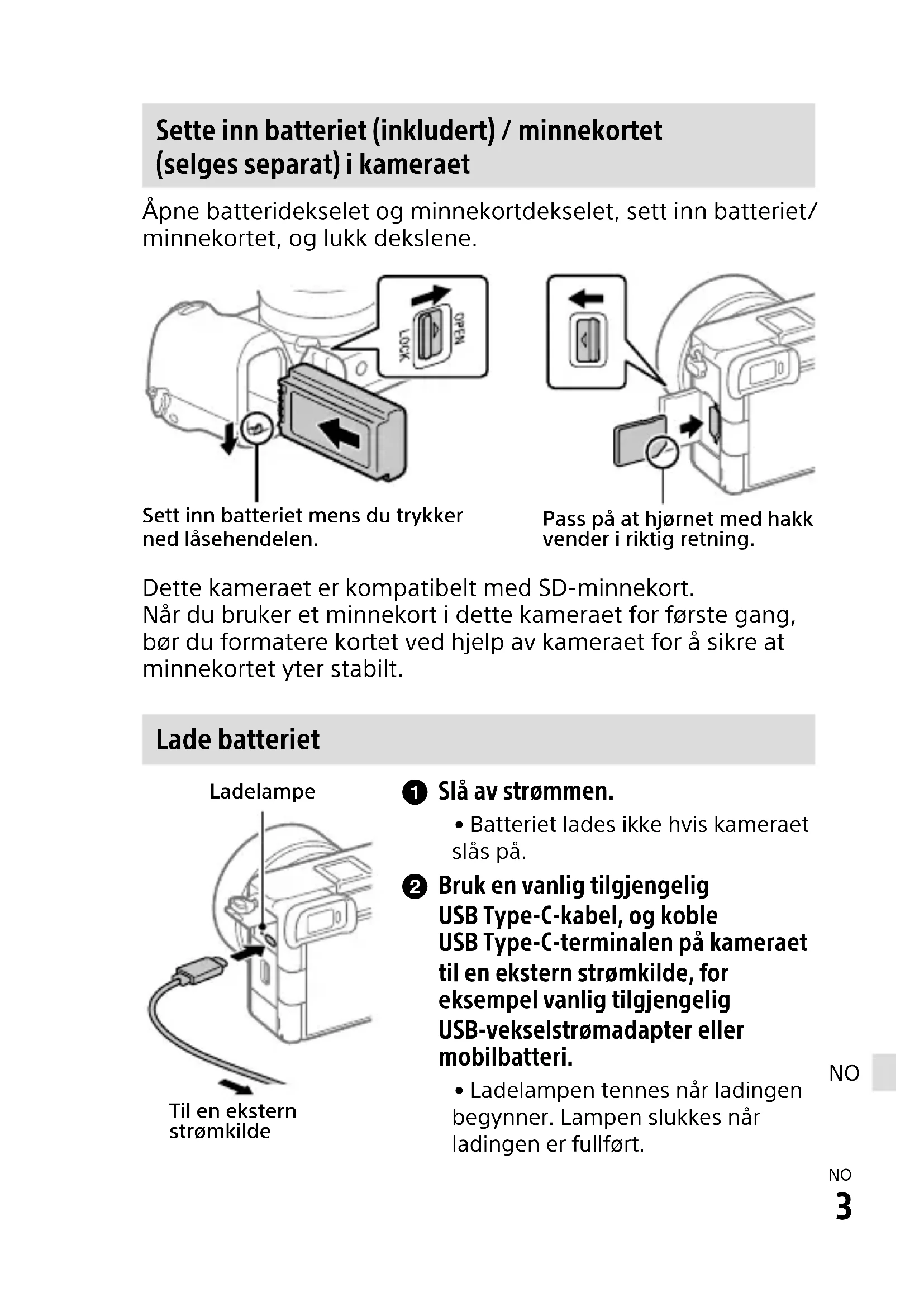 Sette inn batteriet (inkludert) / minnekortet (selges separat) i kameraet Åpne batteridekselet og minnekortdekselet, sett inn batteriet/ minnekortet, og lukk dekslene. Sett inn batteriet mens du trykker ned låsehendelen.Pass på at hjørnet med hakk vender i riktig retning. Dette kameraet er kompatibelt med SD-minnekort. Når du bruker et minnekort i dette kameraet for første gang, bør du formatere kortet ved hjelp av kameraet for å sikre at minnekortet yter stabilt. Lade batteriet LadelampeTil en ekstern strømkilde