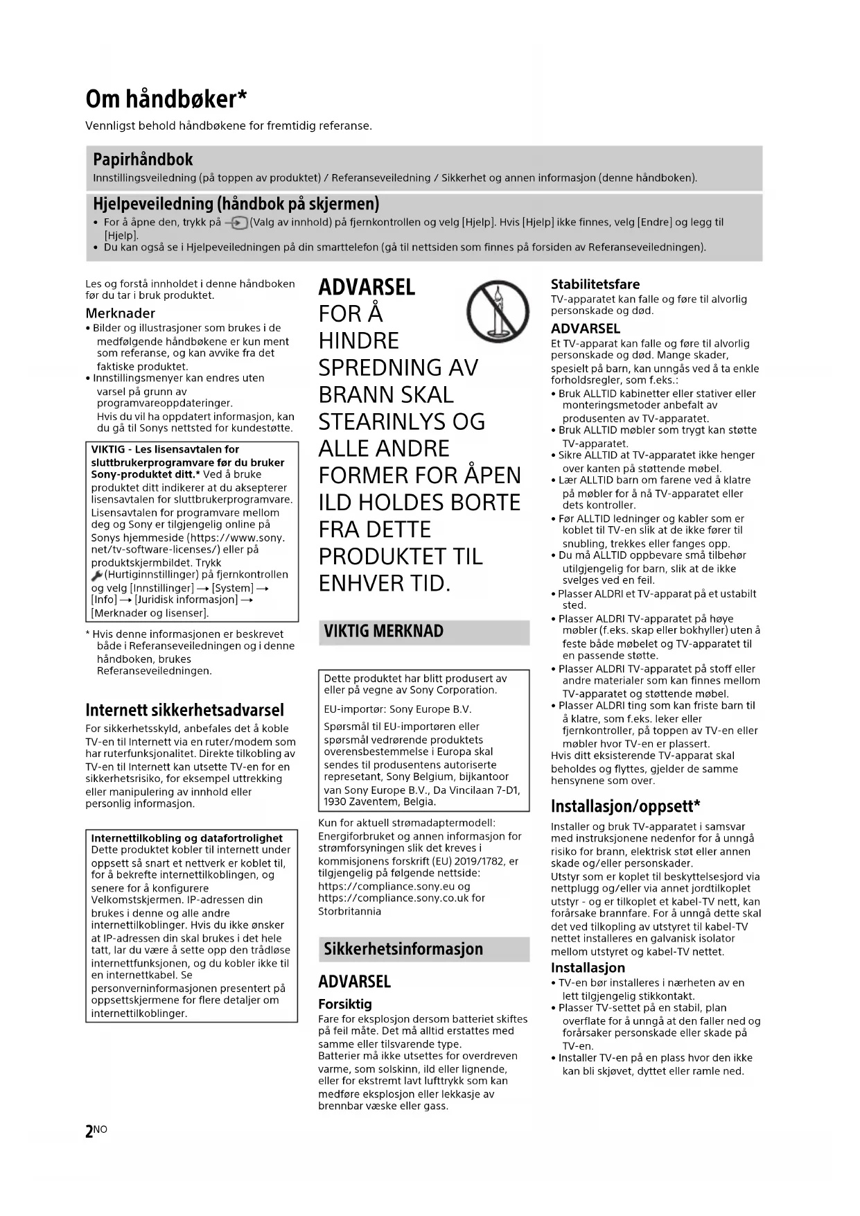 - Bilder og illustrasjoner som brukes i de medfølgende håndbøkene er kun ment som referanse, og kan avvike fra det faktiske produktet.• Innstillingsmenyer kan endres uten varsel på grunn av programvareoppdateringer.Hvis du vil ha oppdatert informasjon, kan du gå til Sonys nettsted for kundestøtte.* Hvis denne informasjonen er beskrevet både i Referanseveiledningen og i denne håndboken, brukes Referanseveiledningen. Internett sikkerhetsadvarsel For sikkerhetsskyld, anbefales det å koble TV-en til Internett via en ruter/modem som har ruterfunksjonalitet. Direkte tilkobling av TV-en til Internett kan utsette TV-en for en sikkerhetsrisiko, for eksempel uttrekking eller manipulering av innhold eller personlig informasjon. ADVARSEL FOR Å HINDRE SPREDNING AV BRANN SKAL STEARINLYS OG ALLE ANDRE