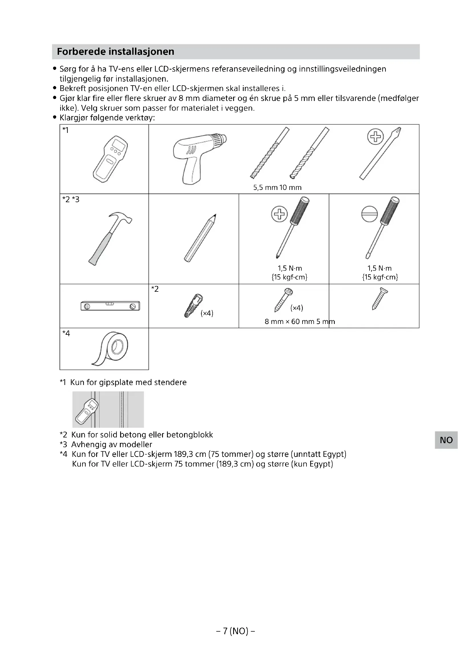 *1 Kun for gipsplate med stendere *2 Kun for solid betong eller betongblokk *3 Avhengig av modeller *4 Kun for TV eller LCD-skjerm 189,3 cm (75 tommer) og større (unntatt Egypt) Kun for TV eller LCD-skjerm 75 tommer (189,3 cm) og større (kun Egypt)− 8 (NO) − Installere veggmonteringsbraketten på veggen 1 Bestemme installasjonsstedet. Sørg for at veggen har nok plass for TV-en eller LCD-skjermen og at den kan støtte en vekt på minst fire ganger TV-ens eller LCD-skjermens. Se TV-ens eller LCD-skjermens referanseveiledning for TV-ens eller LCD- skjermens vekt. Merknad Når TV-en eller LCD-skjermen er installert på veggen, lener øvre side av TV-en eller LCD-skjermen noe fremover. Vi anbefaler at du sjekker posisjonen til TV-en eller LCD-skjermen i visningsmiljøet. 2 Velg veggmonteringsstil som vist nedenfor. 2-a: Standard montering 2-b: Tynn montering