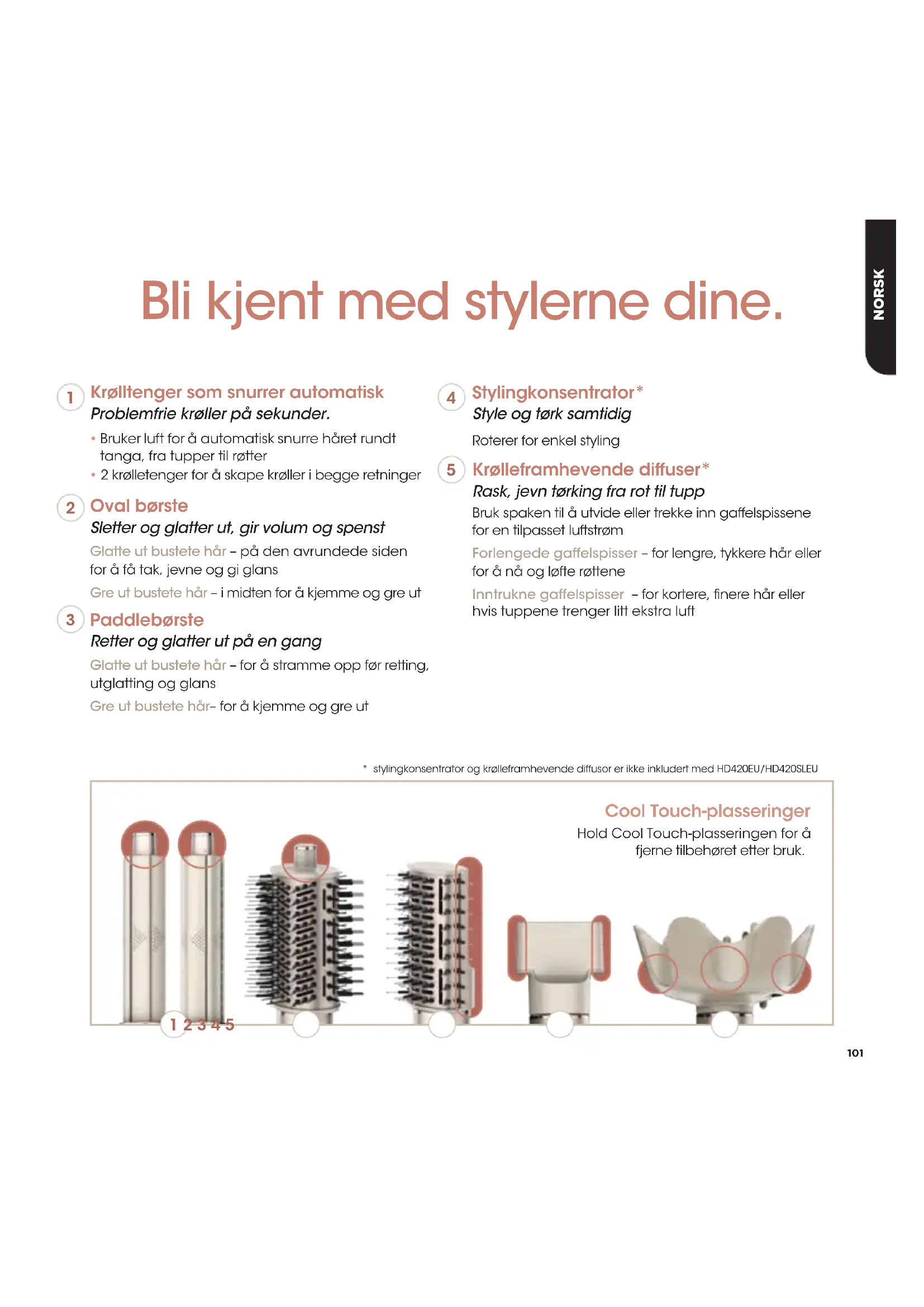- 2 krølletenger for å skape krøller i begge retninger Oval børste Sletter og glatter ut, gir volum og spenst Glatte ut bustete hår – på den avrundede siden for å få tak, jevne og gi glans Gre ut bustete hår – i midten for å kjemme og gre ut Paddlebørste Retter og glatter ut på en gang Glatte ut bustete hår – for å stramme opp før retting, utglatting og glans Gre ut bustete hår– for å kjemme og gre ut Stylingkonsentrator* Style og tørk samtidig Roterer for enkel styling Krølleframhevende diffuser* Rask, jevn tørking fra rot til tupp Bruk spaken til å utvide eller trekke inn gaffelspissene for en tilpasset luftstrøm Forlengede gaffelspisser – for lengre, tykkere hår eller for å nå og løfte røttene Inntrukne gaffelspisser – for kortere, finere hår eller hvis tuppene trenger litt ekstra luft